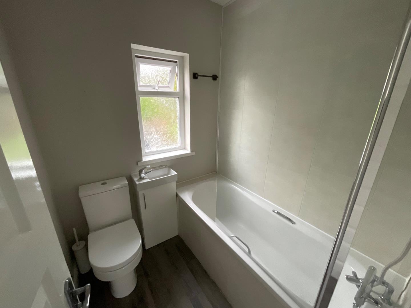 Classic white bathroom suite including low flush WC, wall mounted wash hand basin and panelled bath with shower attachment overhead, vinyl flooring, recessed lighting