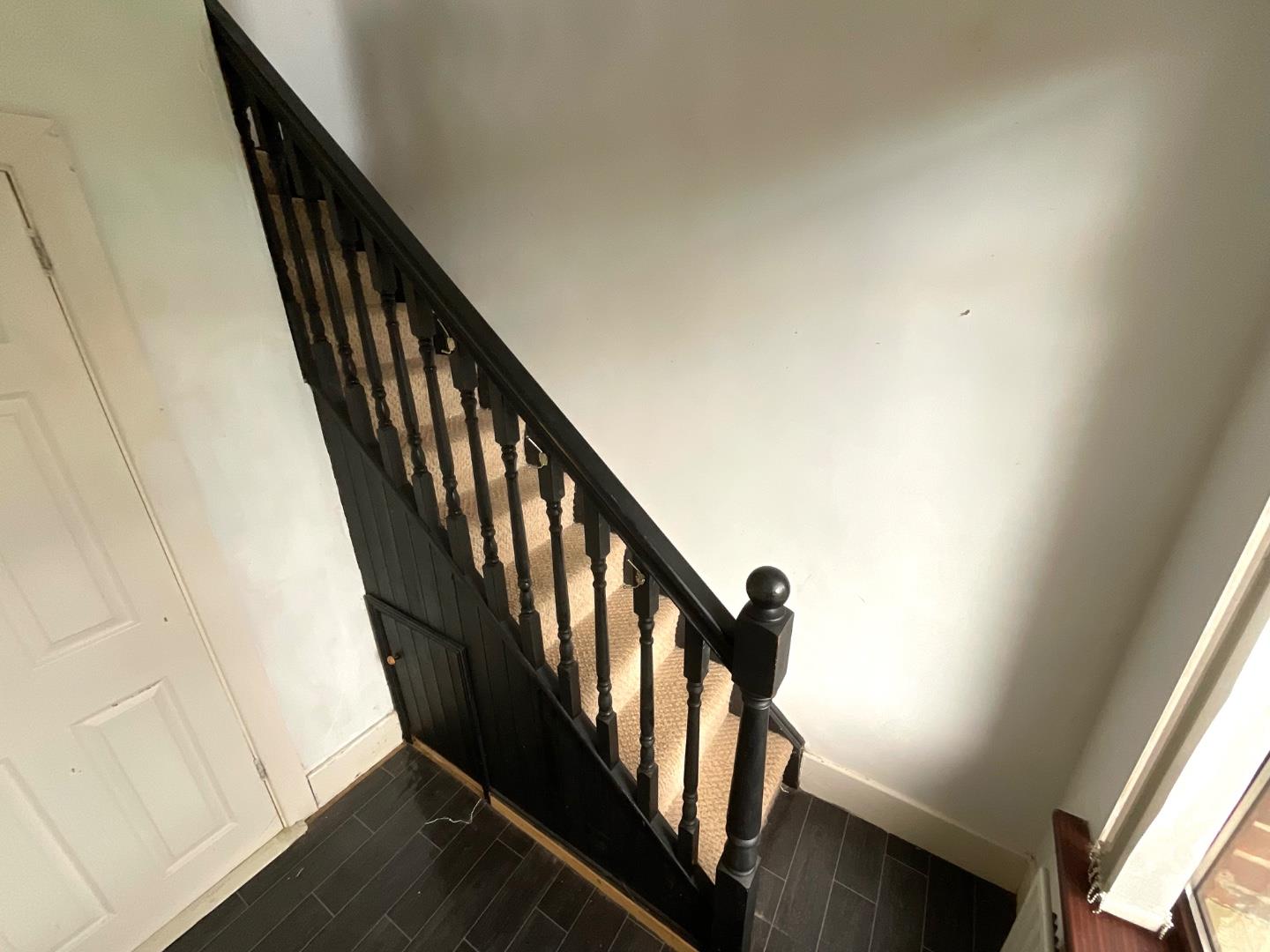 PVC front door with glass inset,, double panelled radiator, wood laminate flooring, recessed lighting, under stair storage