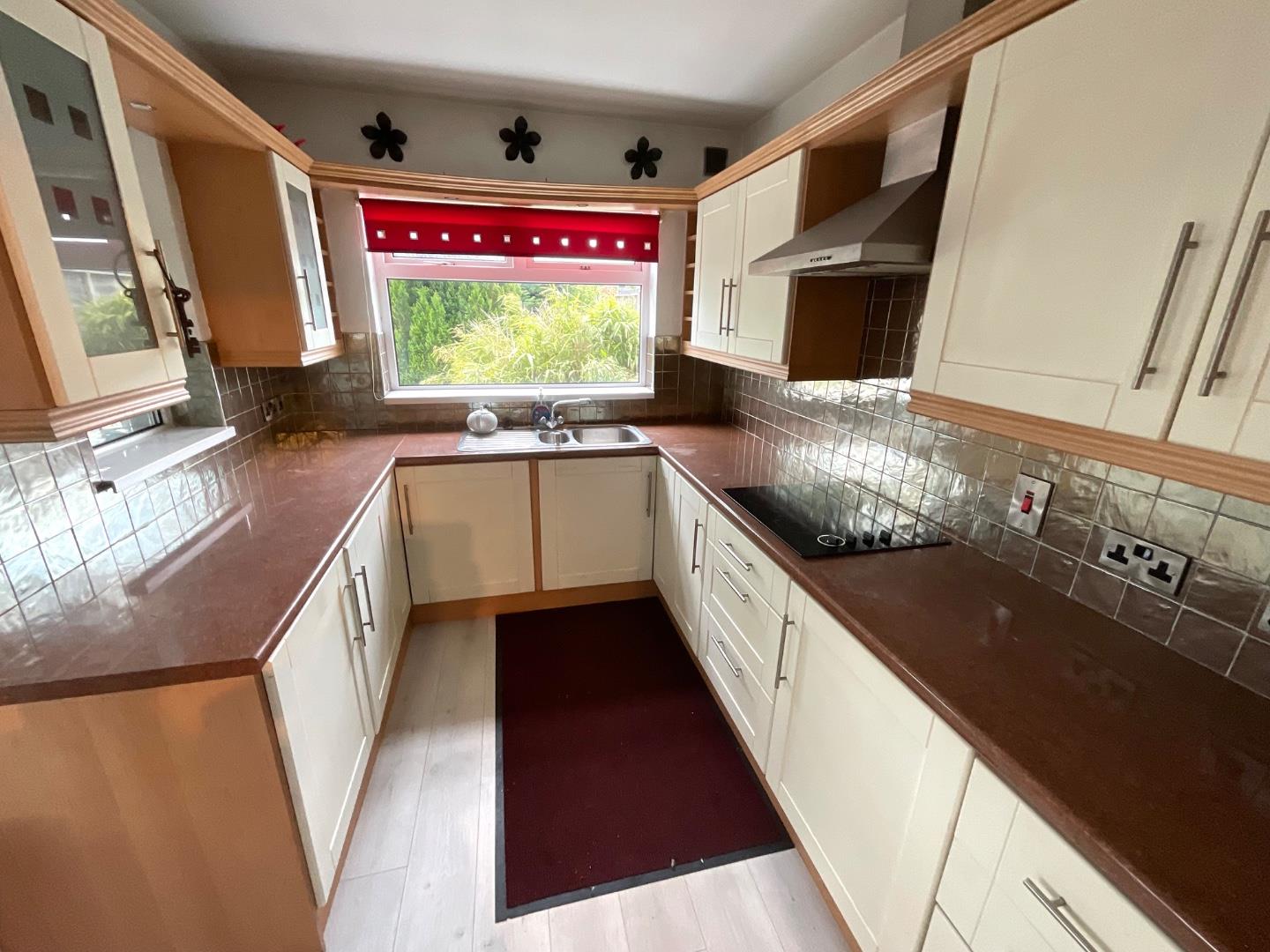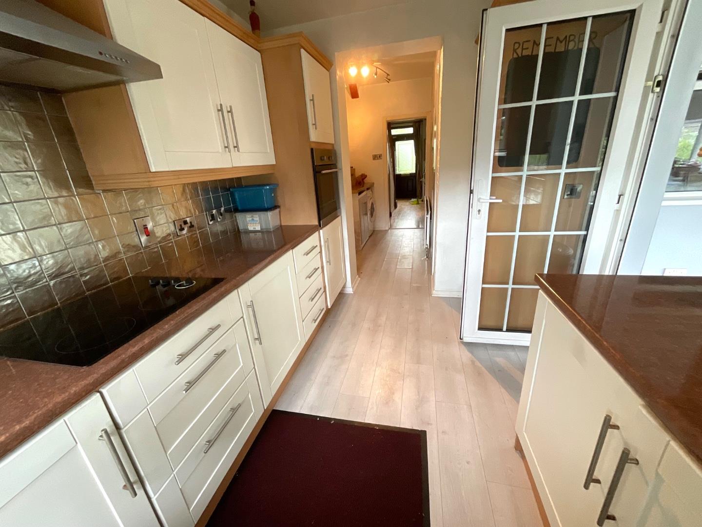 Fitted kitchen with both high and low level units, tiled splash backs and contrasting worktops, stainless steel bowl and a half sink and drainer with mixer taps, integrated oven and hob with extractor hood, plumbed for a washing machine, enclosed storage cupboard, double panelled radiator, wood laminate flooring, leading to;