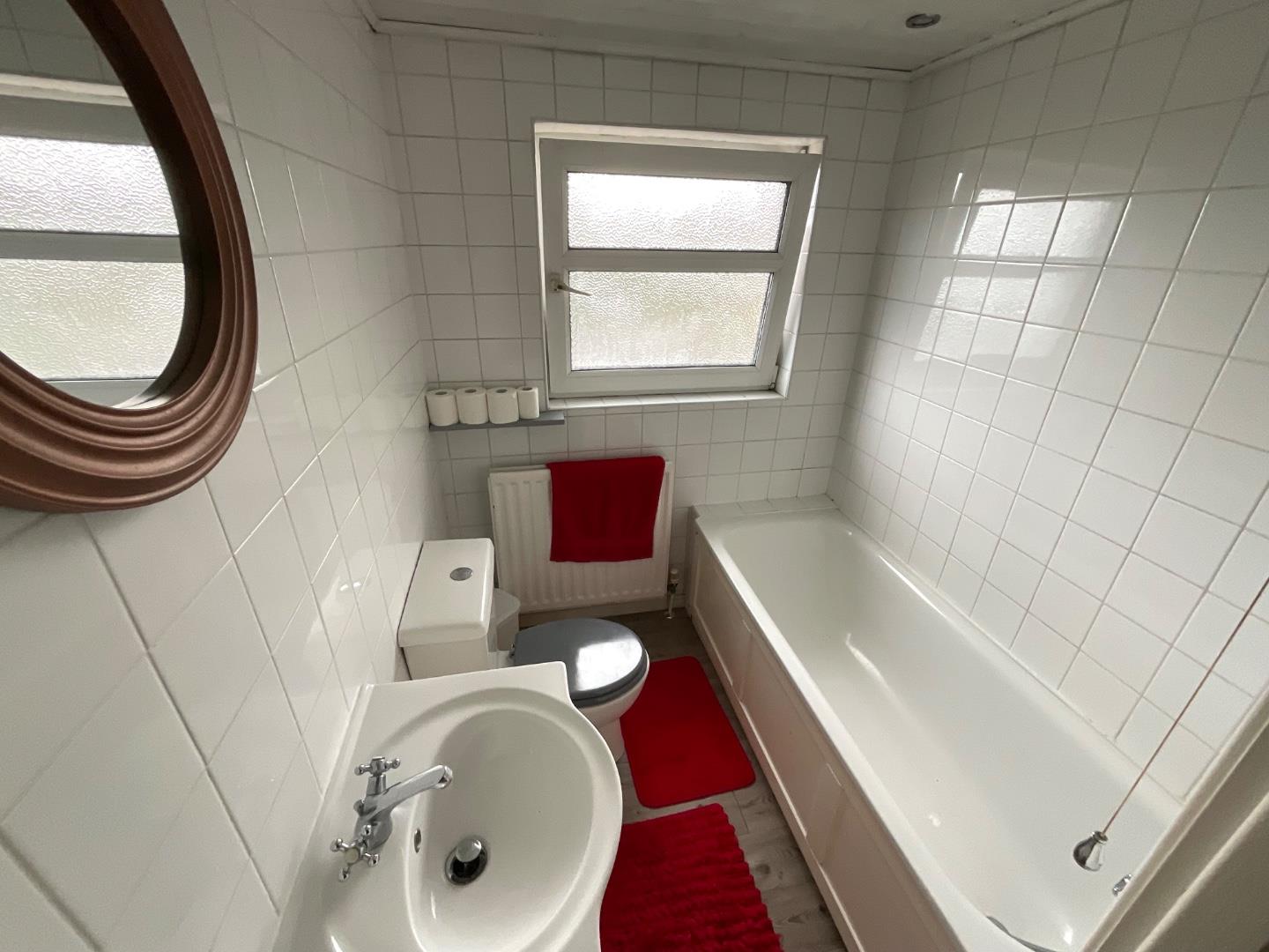 Classic white bathroom suite including low flush WC, wall mounted wash hand basin and panelled bath, double panelled radiator, recessed lighting