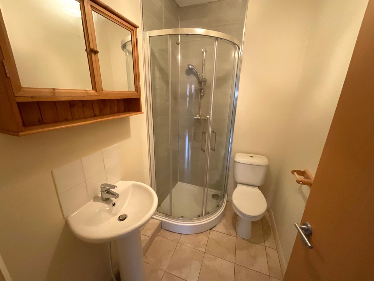 Spacious en suite including low flush WC, pedestal wash hand free standing shower, tiled flooring, panelled radiator