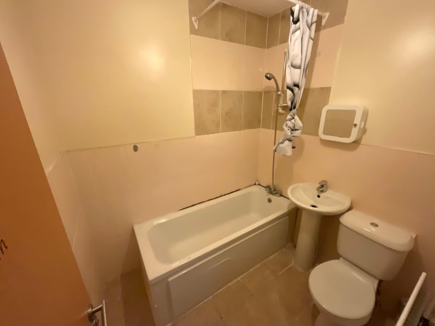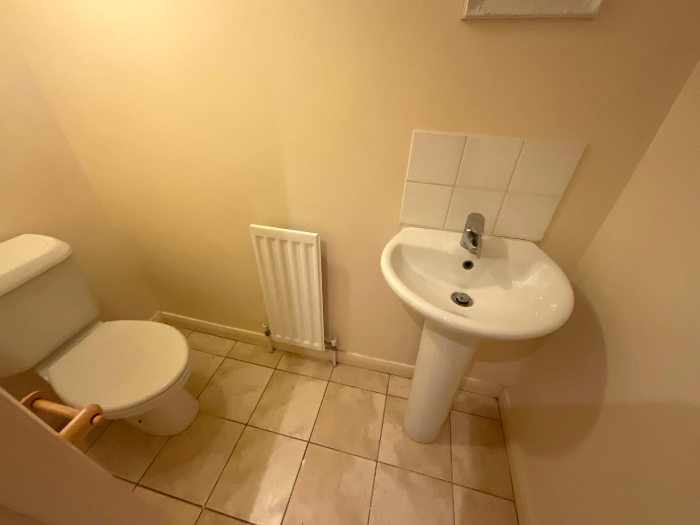 Low flush WC, pedestal wash hand basin, tiled flooring, panelled radiator, extractor fan