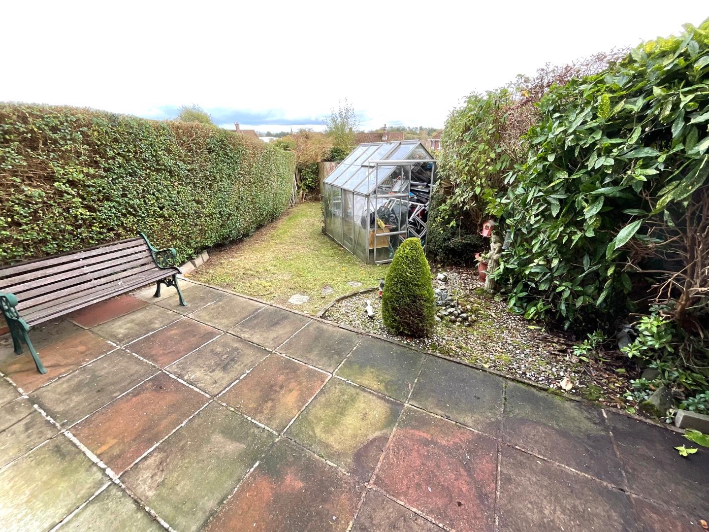 Mature garden laid out in lawn with patio area, attractive water feature, enclosed oil boiler house