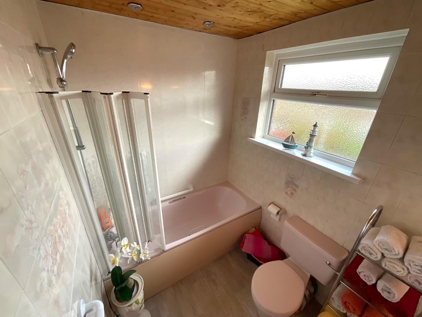 Coloured bathroom suite including low flush WC, pedestal wash hand basin and panelled bath with shower attachment overhead, vinyl flooring, tiled walls, recessed lighting, panelled radiator