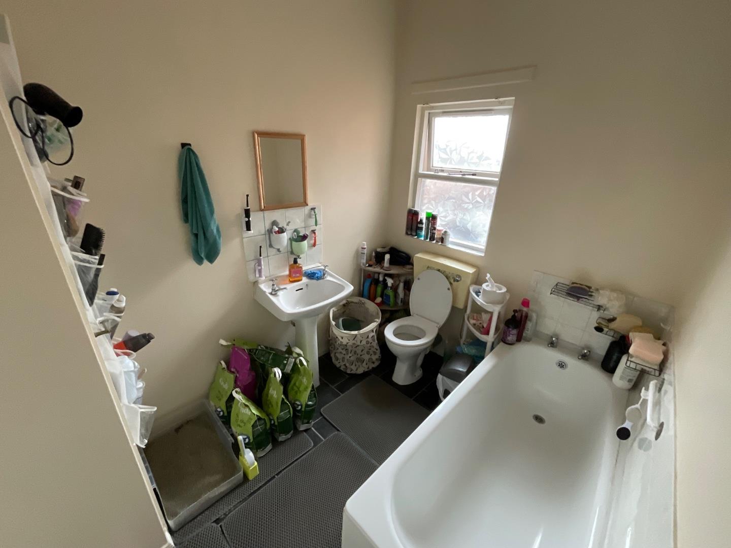 Classic white bathroom suite including low flush WC, pedestal wash hand basin and panelled bath, vinyl flooring, panelled radiator