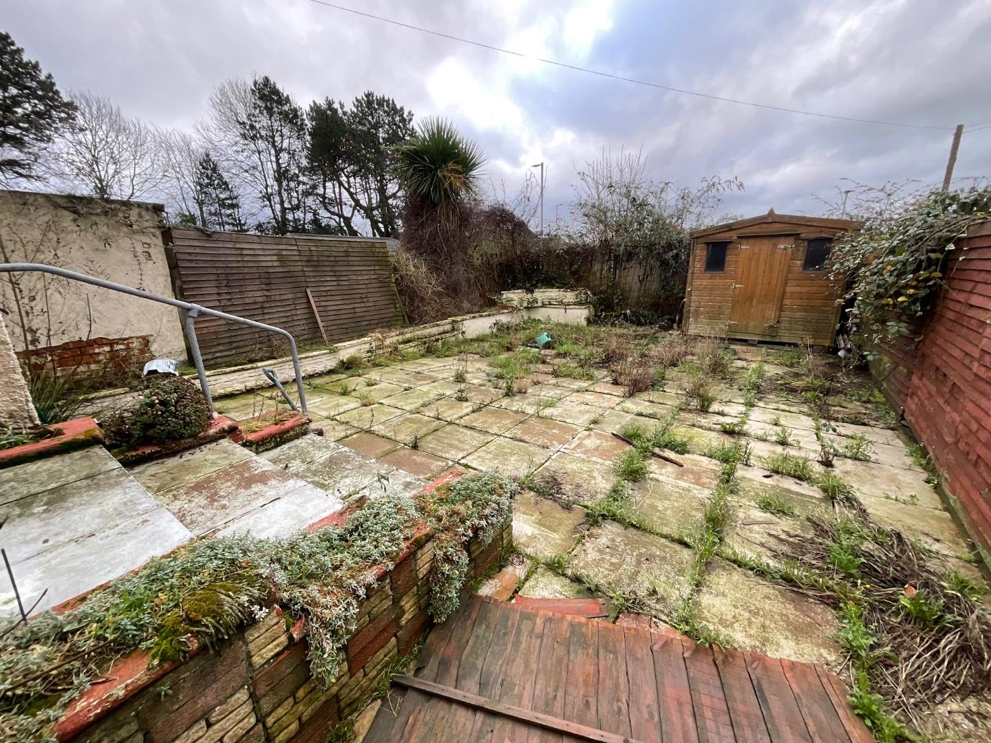 Large paved garden, garden shed, exterior lighting
