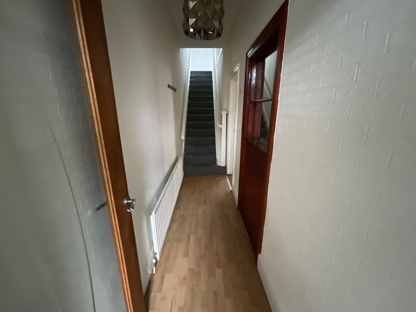 Wood laminate flooring, panelled radiator, stairs leading to first floor