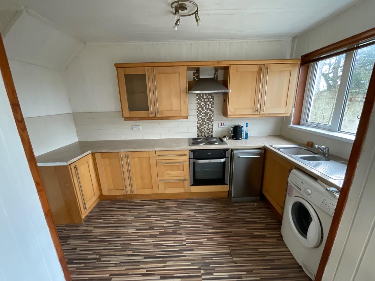 Fitted kitchen with both high and low level units, tiled splash backs and contrasting worktops, stainless steel bowl and a half sink and drainer with mixer tap, integrated oven and hob with extractor hood, plumbed fir a washing machine