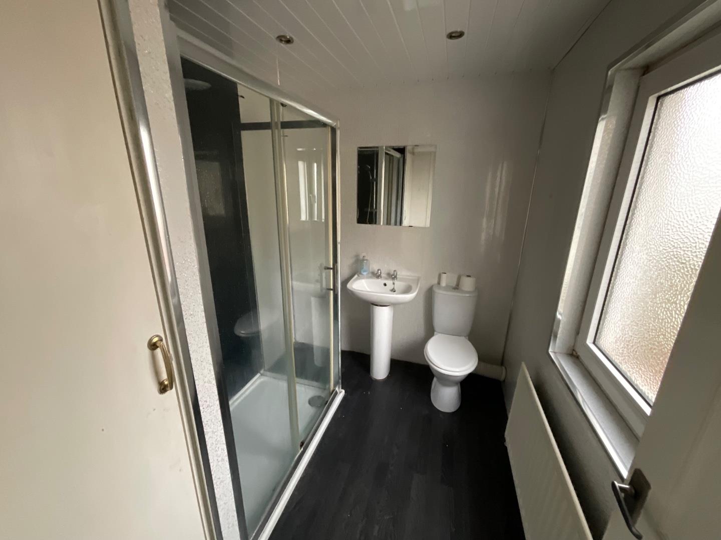 Classic white bathroom suite including low flush WC, pedestal wash hand basin and free standing shower, PVC cladded walls and ceiling, recessed lighting, enclosed storage cupboard housing gas boiler, panelled radiator