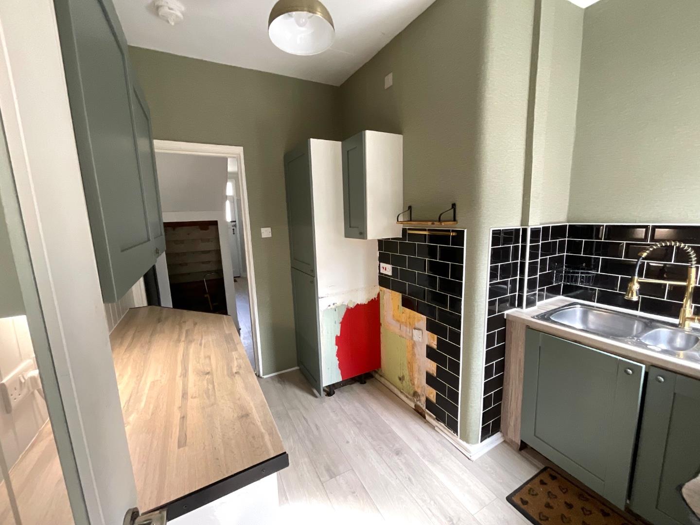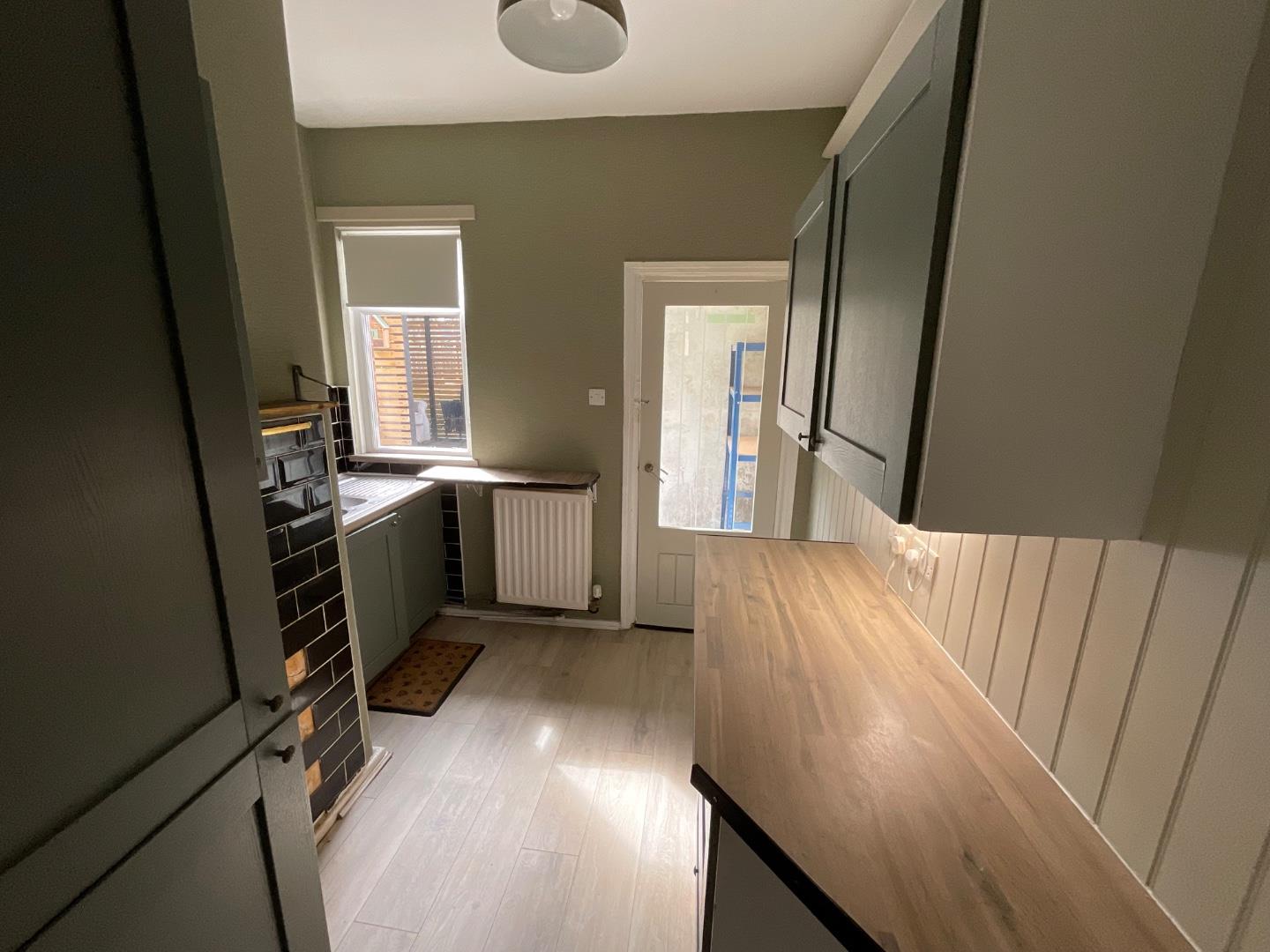 Fitted kitchen with high and low level units, tiled splash backs and contrasting worktops, stainless steel bowl and a half sink and drainer with mixer taps, wood laminate flooring, double panelled radiator