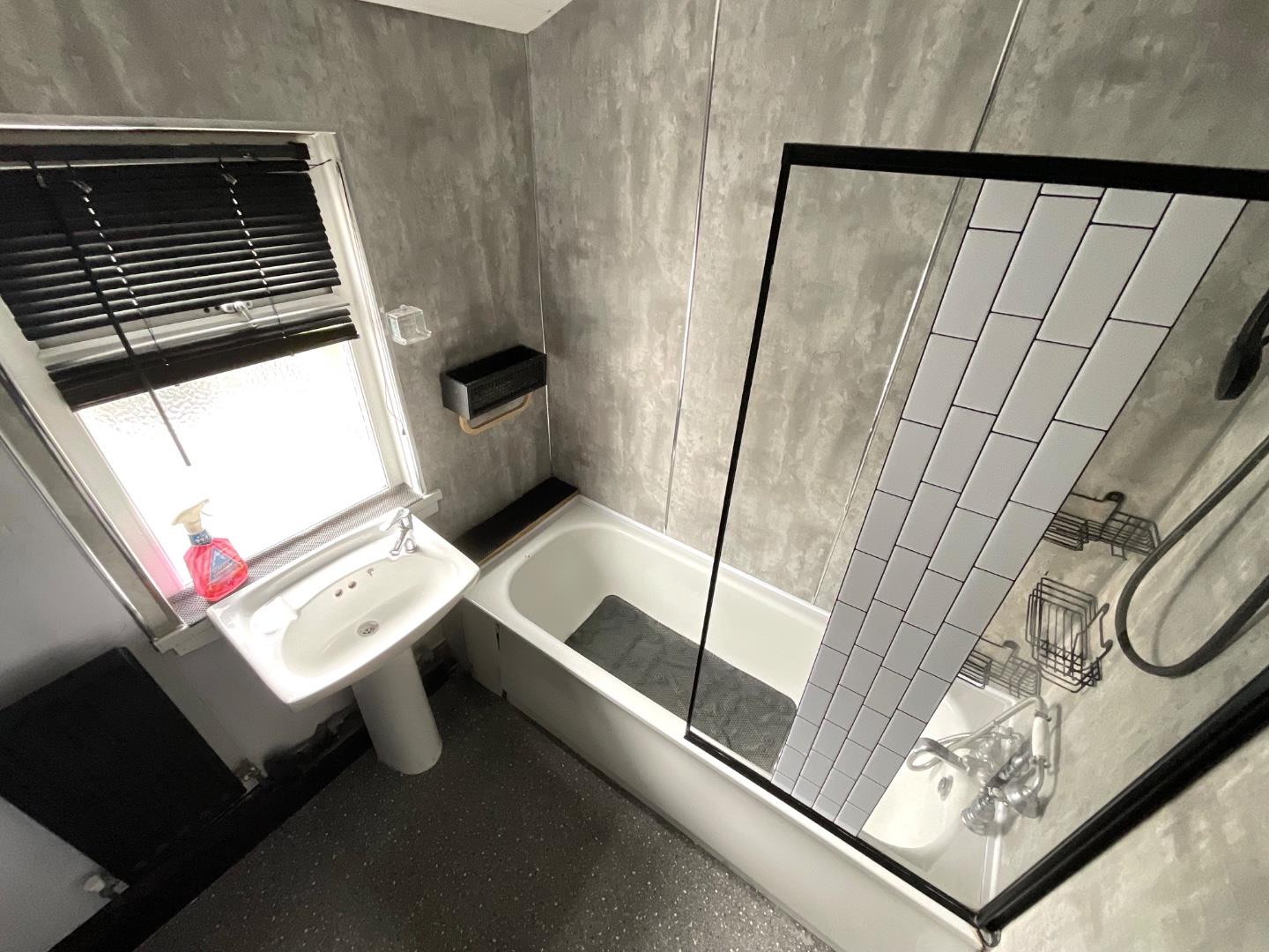 White bathroom suite including low flush WC, pedestal wash hand basin and panelled bath with electric shower overhead, PVC classed walls and ceiling, enclosed storage cupboard, panelled radiator