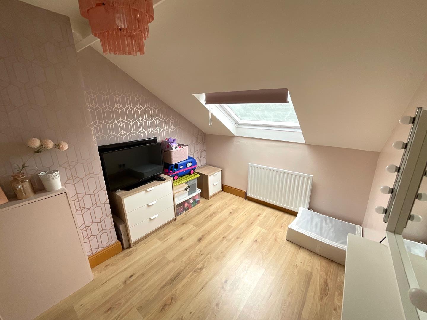 Wood laminate flooring, panelled radiator, access to roof space
