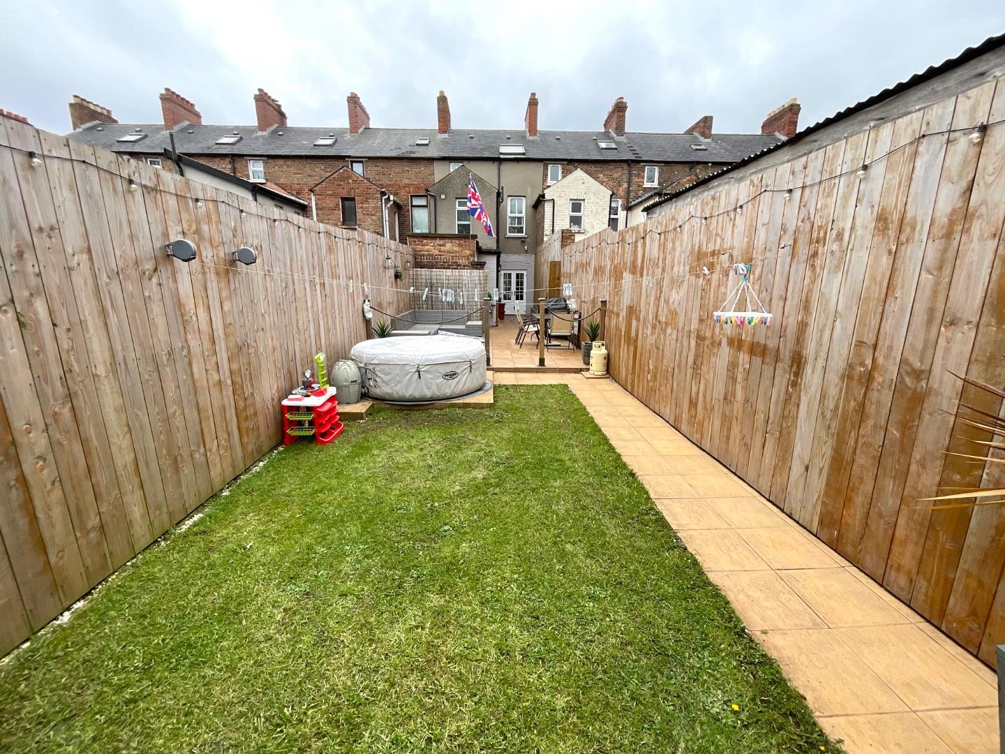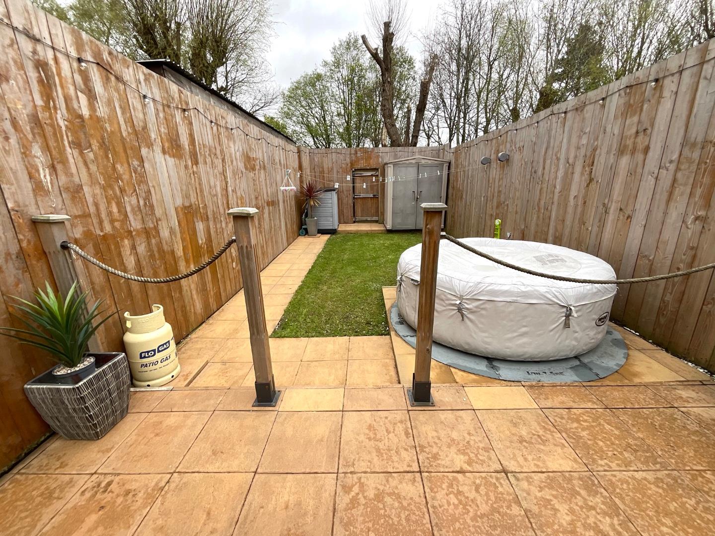 Private gardens with wood panelled fencing surround, generous flagged patio area, enclosed oil boiler house, garden laid out in lawn, access to rear entry, water tap, external lighting
