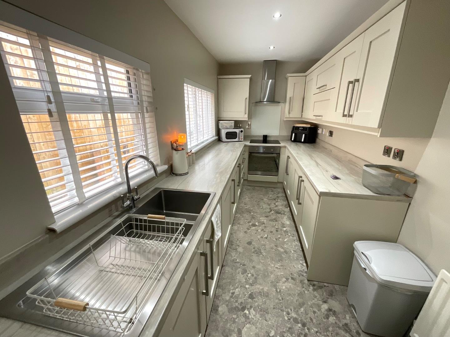 Modern fitted kitchen with a wide range of high and low level units and contrasting worktops, stainless steel bowl and half sink and drainer with mixer taps, integrated oven and hob with extractor hood, integrated fridge and freezer and washing machine, recessed lighting, under stair storage, vinyl flooring, double panelled radiator, access to rear patio