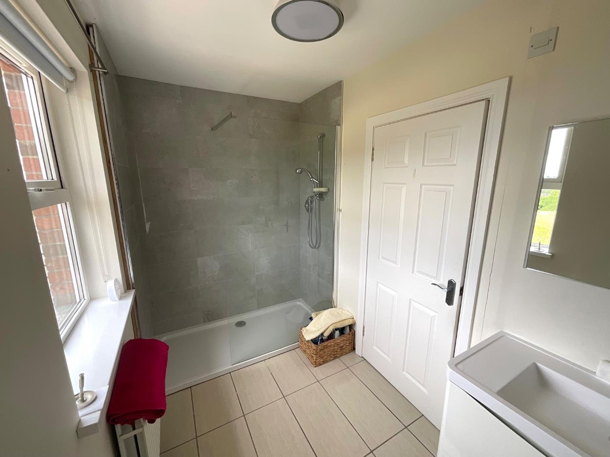 Low flush WC, wall mounted wash hand basin and free standing double showers tiled flooring, double panelled radiator
