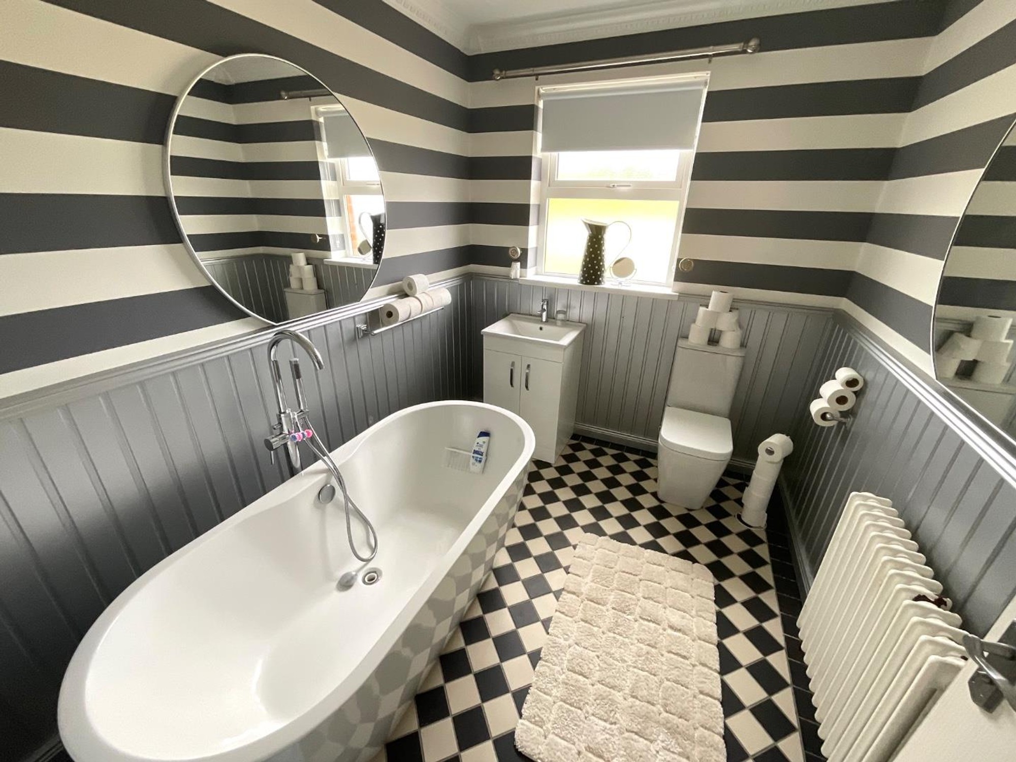 Three piece bathroom suite including low flush WC, wall mounted wash hand basin and free standing bath, recessed lighting, tiled flooring, panelled radiator