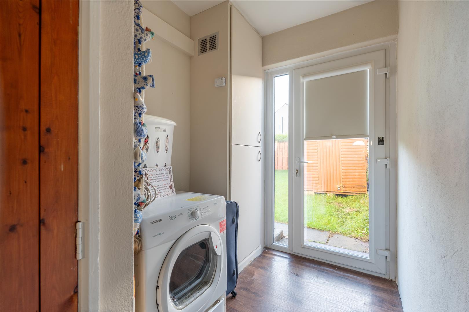 Wood laminate floor; built-in storage cupboard.