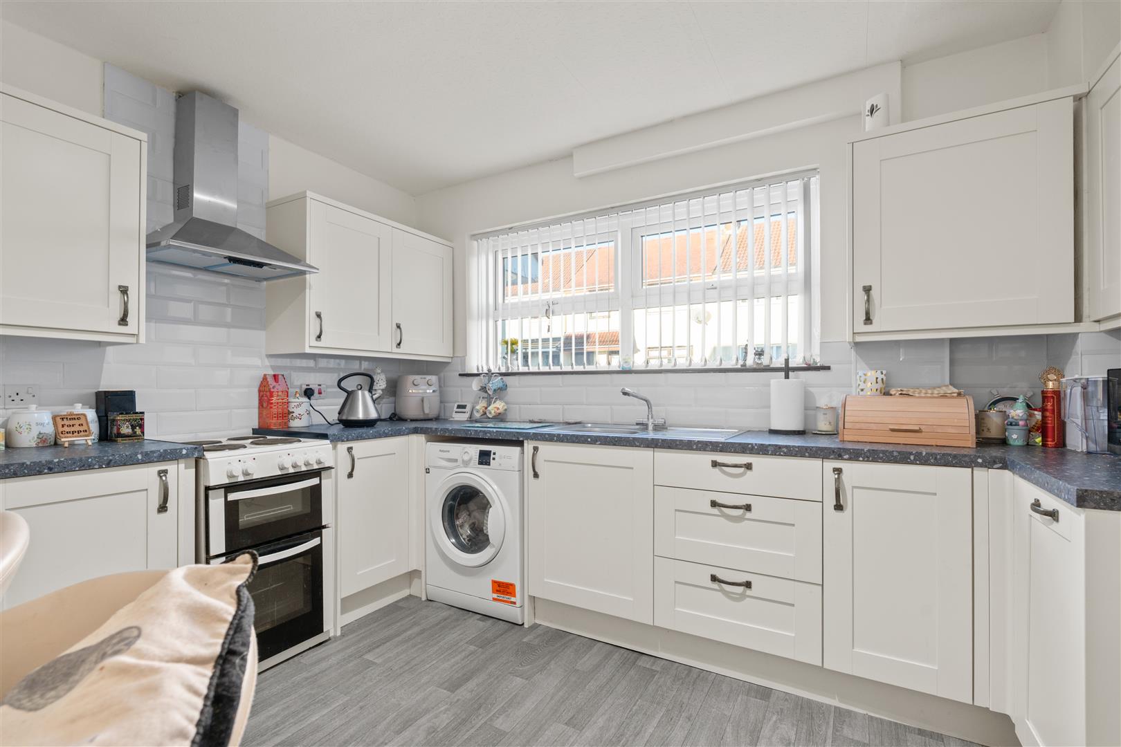 Excellent range of modern wood laminate high and low level cupboards and drawers with matching glazed display cupboards incorporating single drainer stainless steel sink unit with mixer tap; space for electric cooker; extractor hood over; space and plumbing for washing machine; Hisense dishwasher; space for fridge / freezer; formica worktops; tiled splashback.