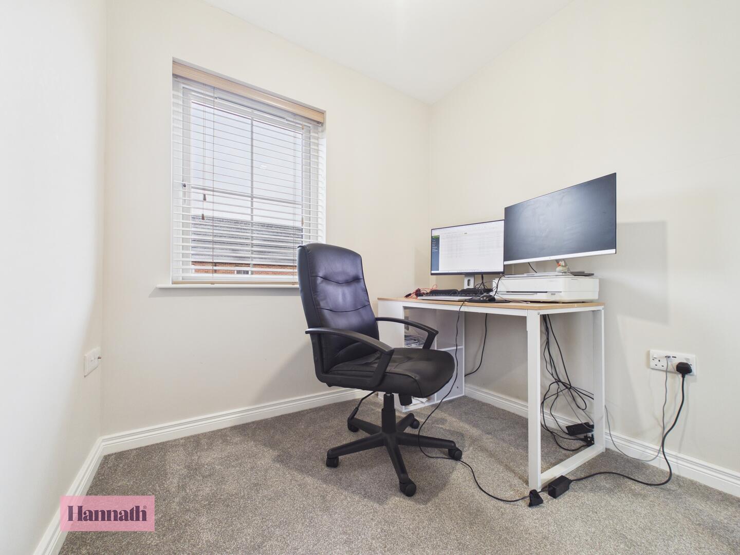 Bedroom Three is a smaller room, suitable for use as a bedroom or study. It has neutral carpeting and walls with a window providing natural light and a peaceful outlook, making it a versatile space.