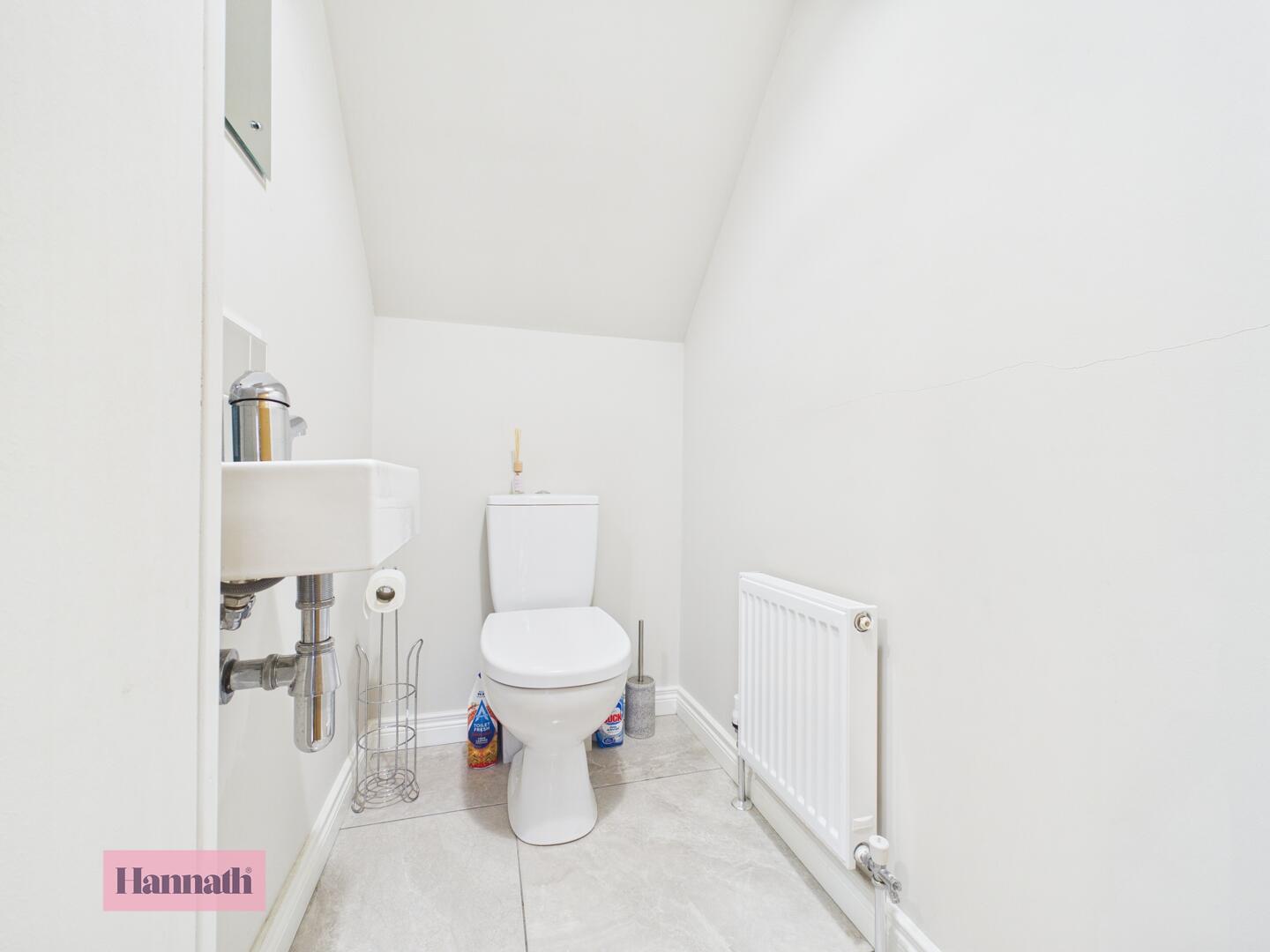 This practical WC on the ground floor is finished with tiled flooring and includes a modern white toilet and a small hand basin. It benefits from a simple, clean design with a radiator and neutral decor.