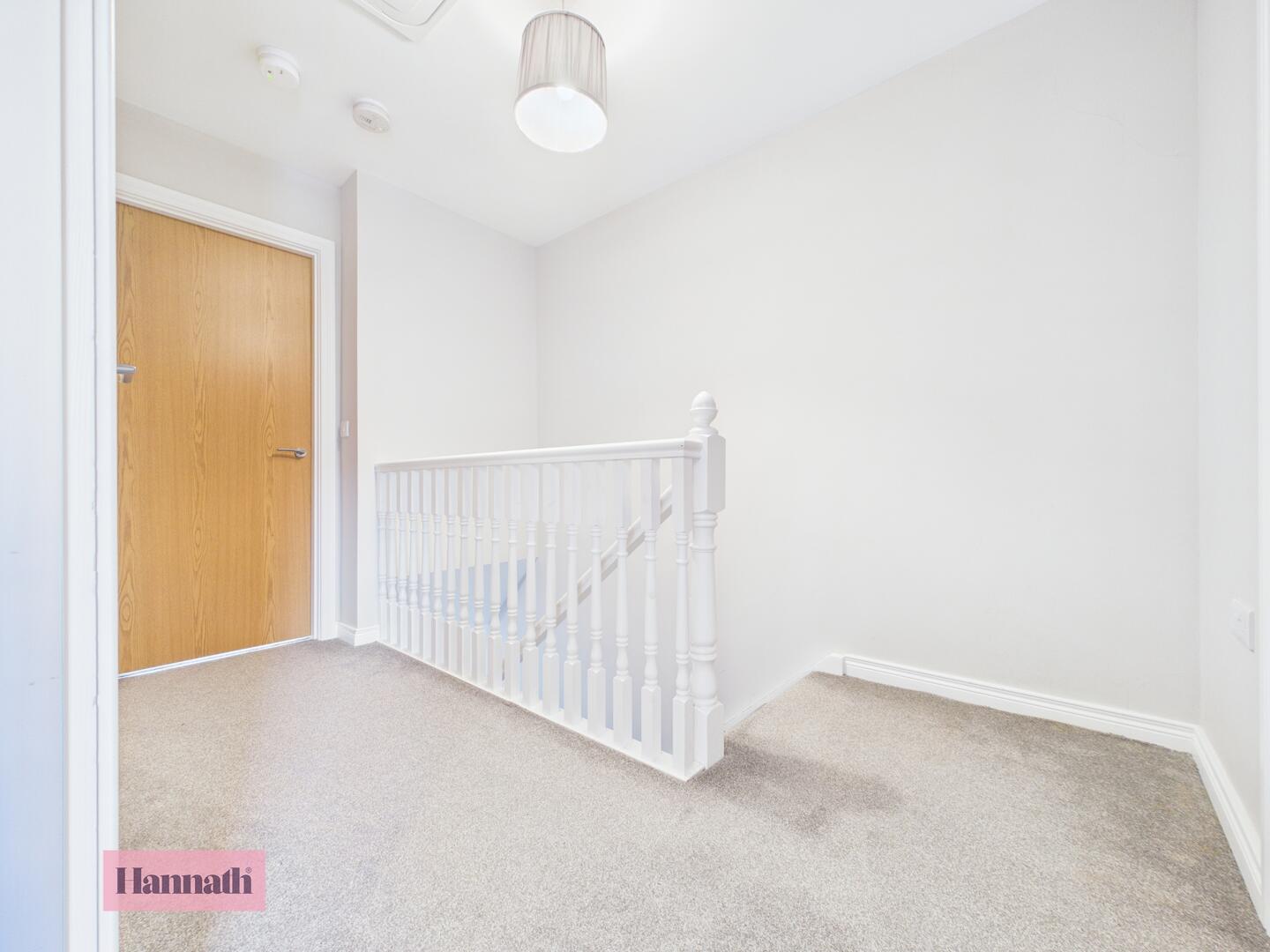 The landing upstairs is carpeted and painted in soft neutral tones, with a white banister and access to all first-floor rooms. The space feels light and airy with a ceiling light fitting and a door to the staircase below.