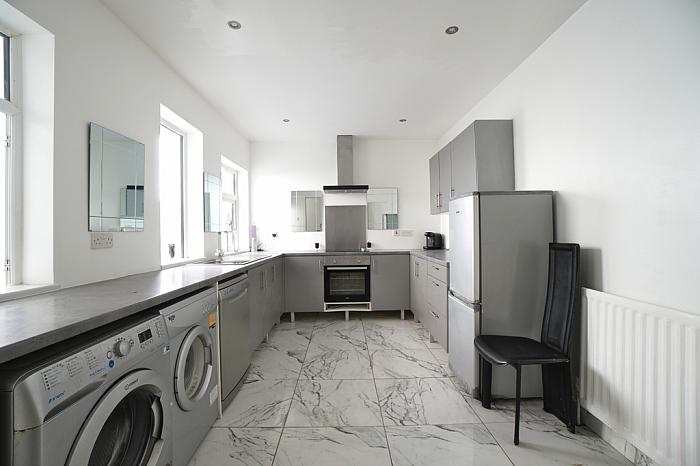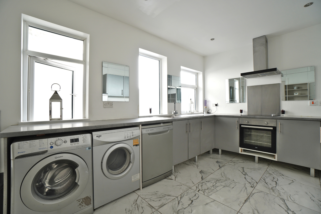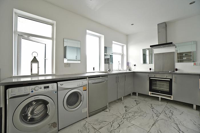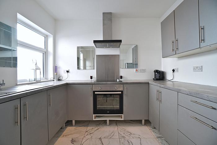 Ceramic tiled marble effect floor, Single panel radiator, High and low level units, Integrated electric oven, Integrated electric hob, Plumbed for washing machine, Plumbed for dishwasher, Space for tumble dryer, Extractor hood, 3 x uPVC double glazed windows, Stainless steel sink with drainer, Mixer tap, Storage cupboard, Recessed spotlights, uPVC double glazed rear door.