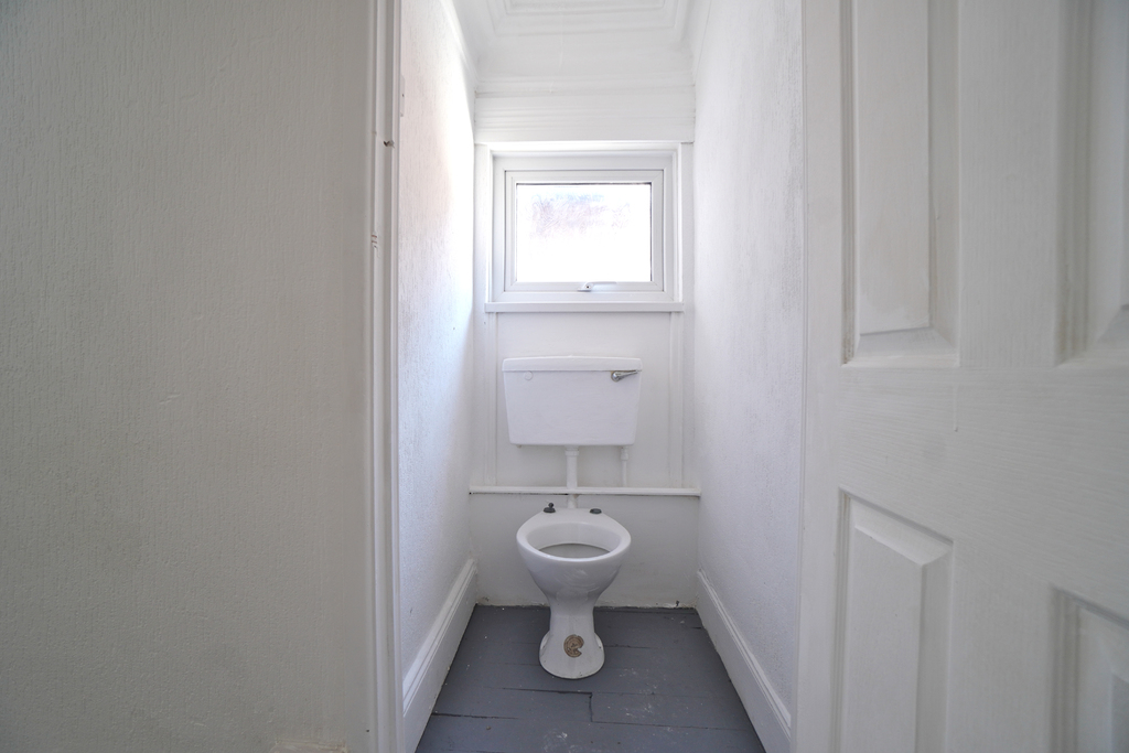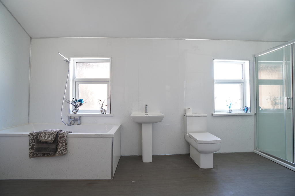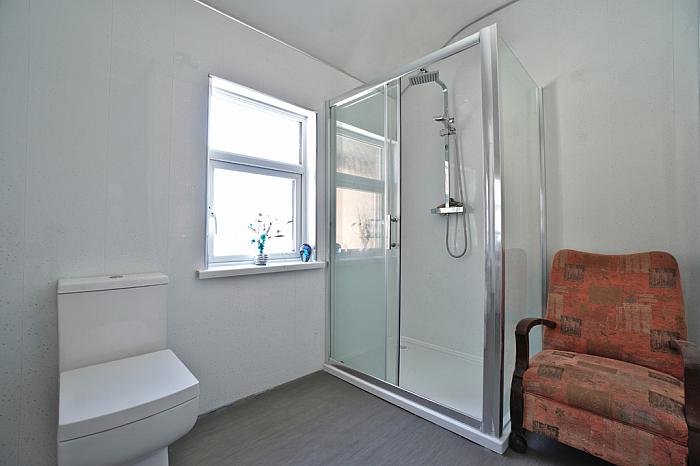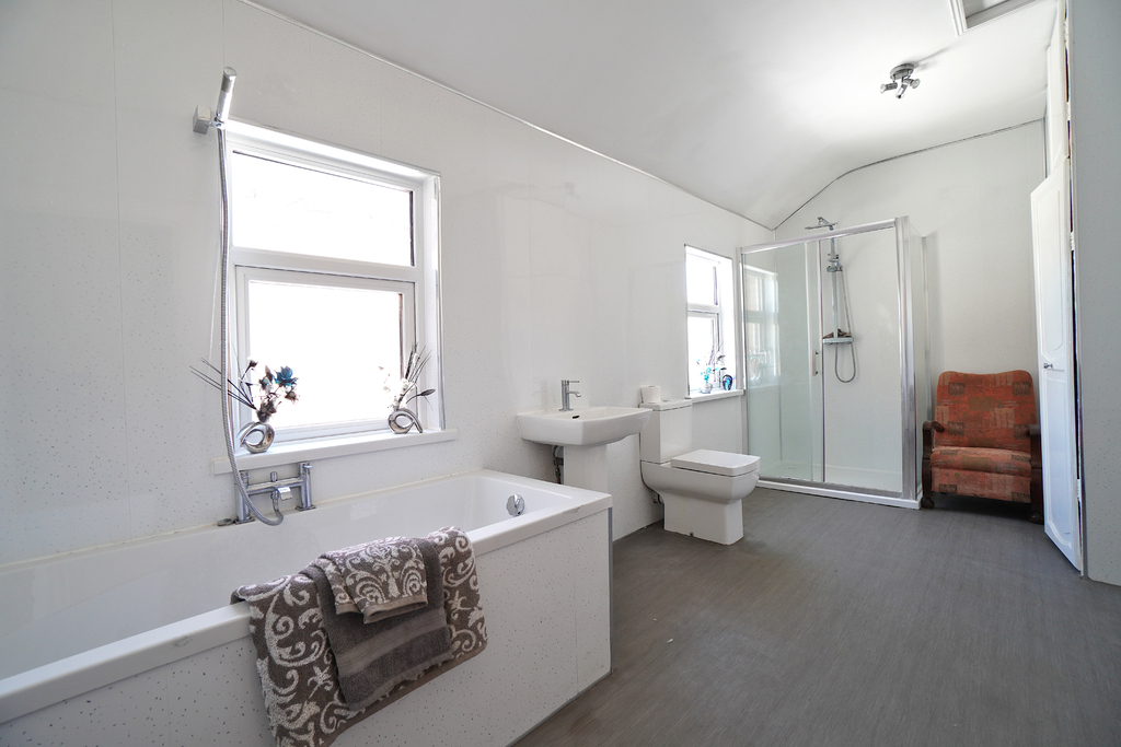 Vinyl floor, Double panel radiator, uPVC wall cladding, Bath with mixer tap and shower attachment, White twin flush WC, White pedestal wash hand basin, Shower tray, Sliding door shower enclosure, Thermostatic valve shower, 2 x uPVC double glazed window, Storage cupboard, Access to roof-space, Wooden door.