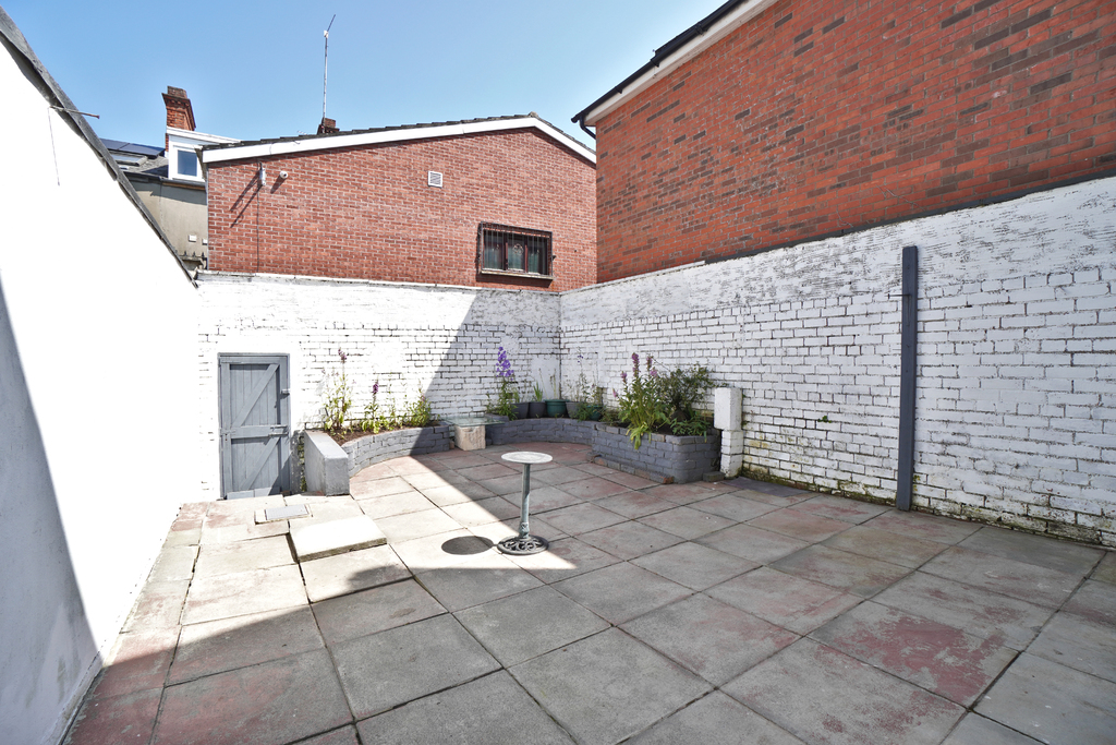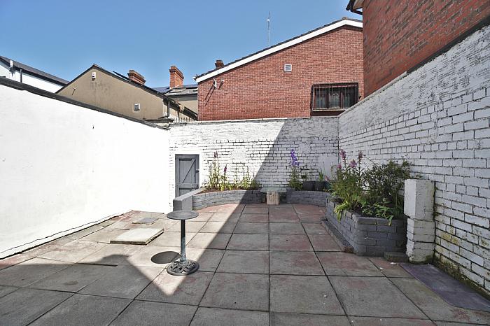 Large paved patio, Brick built flower bed, access to rear alley, Storage area, Gas boiler.