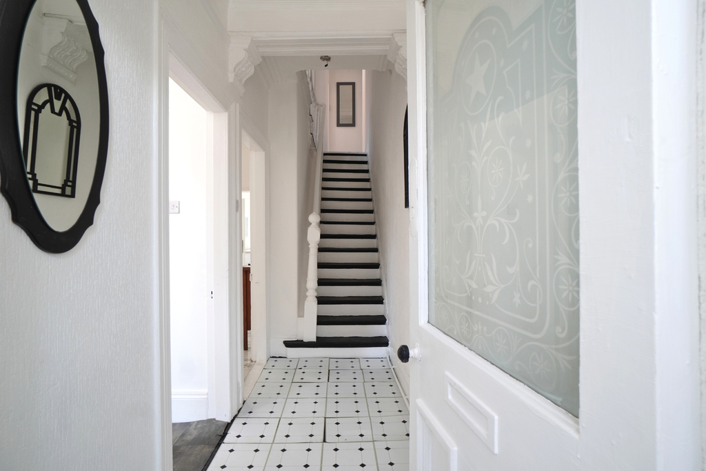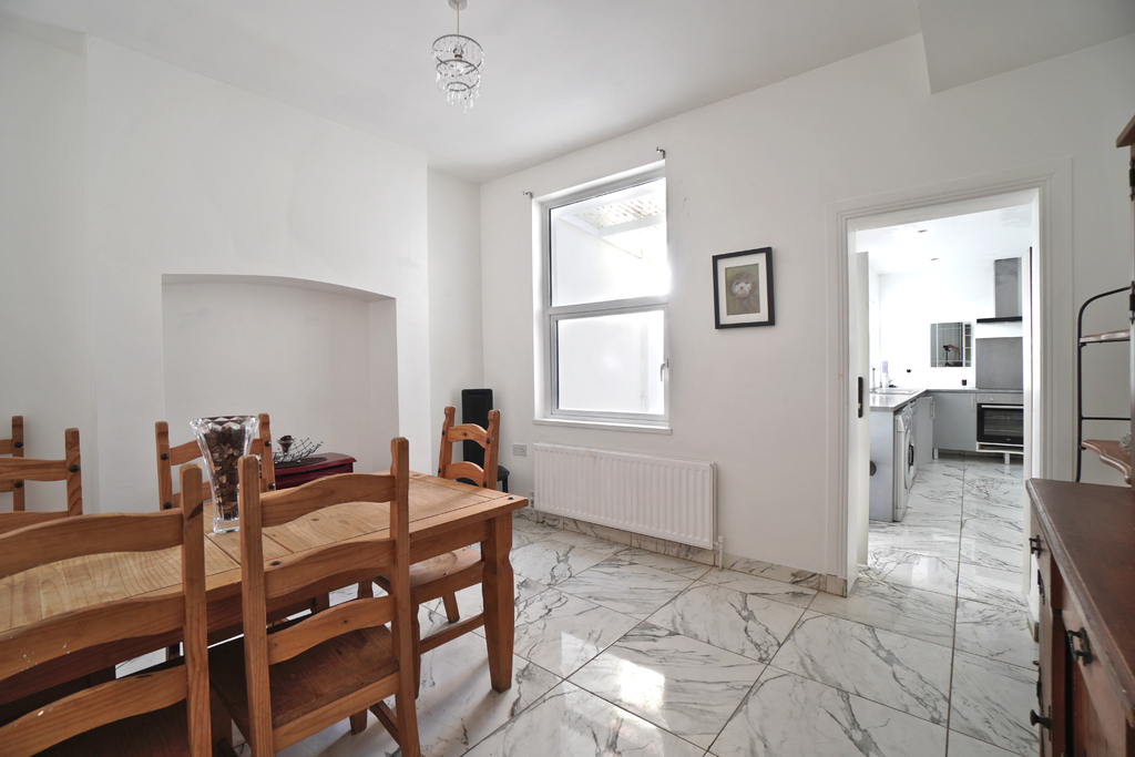 Step inside to discover a bright and spacious living room, complete with a large bay window and a brick fireplace. The ground floor also encompasses a dining room and a fitted kitchen complete with marble effect tiles. Many rooms throughout the property have retained their original architrave, skirting boards, ceiling roses and cornicing providing a strong sense of character.