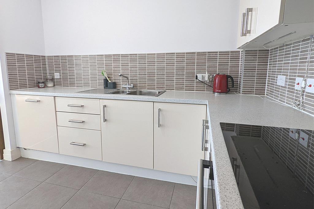 The apartment is fully furnished and includes a modern kitchen with integrated oven, induction hob, dishwasher and fridge freezer. A large open plan living area leads to a south facing balcony.