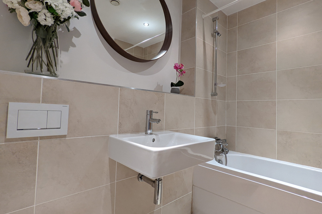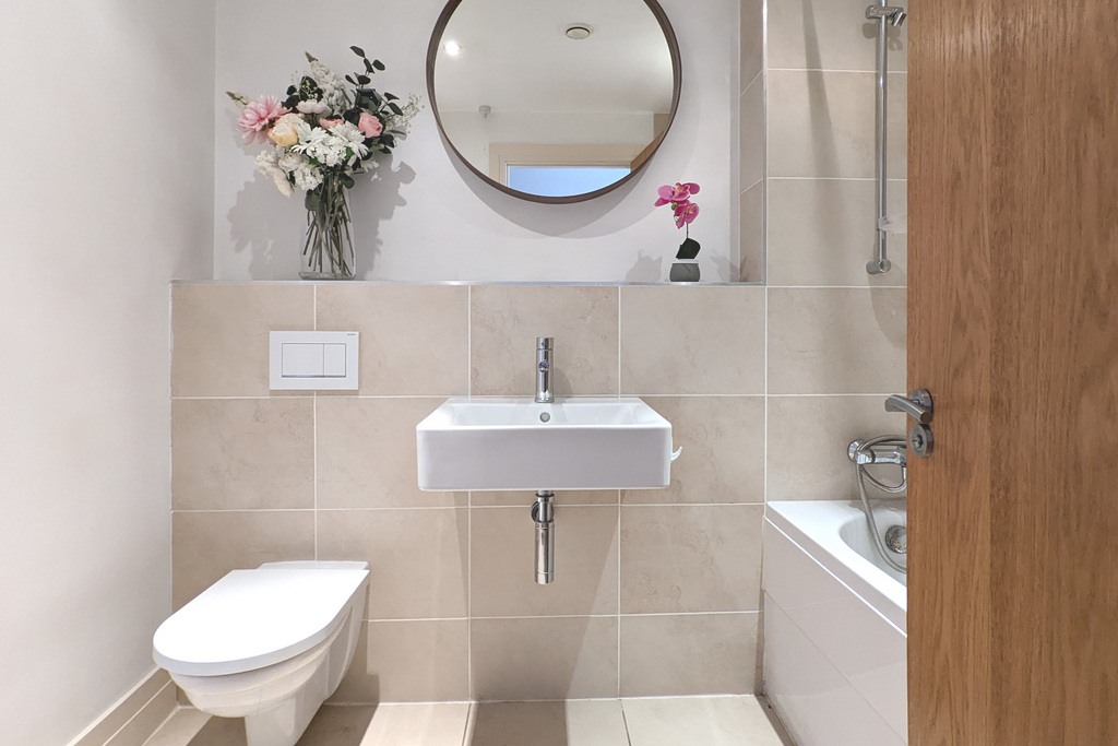 A contemporary tiled bathroom and en-suite shower room feature deluxe appointments.