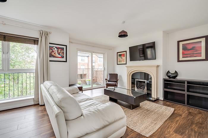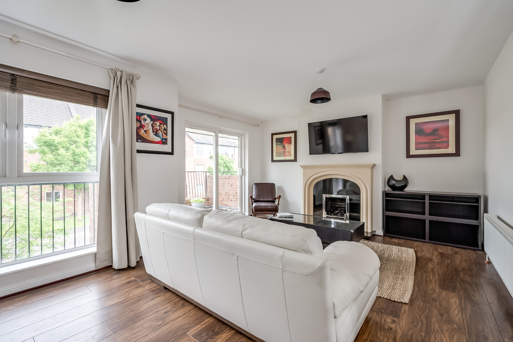 Wood effect laminate flooring, Single panel radiator x 2, uPVC Double glazed window, uPVC Double glazed sliding doors, Gas fire, Sandstone effect fire surround, Granite hearth, Balcony with iron railings.