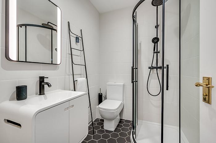 Hexangonal ceramic tiled floor, Ceramic tiled walls, Wall hung vanity basin unit, Twin flush WC, Quadrant shower tray, Sliding door shower enclosure, Thermostatic valve shower, Heated towel rail, Recessed spotlights, Extractor fan