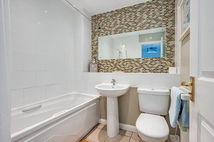 Ceramic tiled floor, Ceramic tiled walls, Twin flush WC, Pedestal wash hand basin, Bath, Mosaic tiled splashback, Electric shaver point, Single panel radiator, Extractor fan.