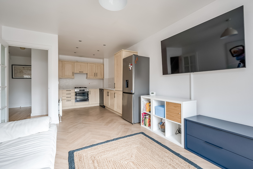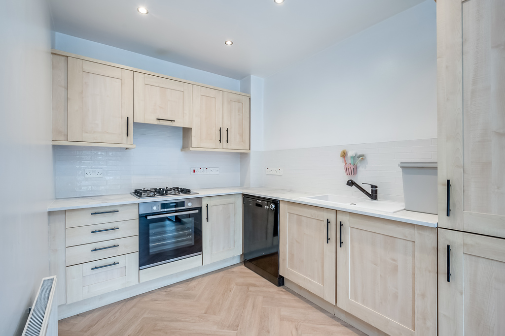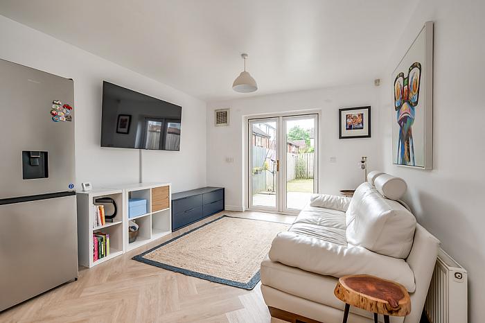 LVT herringbone flooring, Range of high and low level units, Marble effect worktop, Composite sink with drainer, Integrated electric oven, Integrated gas hob, Extractor hood, Space for dishwasher, Space for fridge-freezer, Tiled splashback, Single panel radiator x 2, Recessed spotlights, uPVC Double glazed French doors.