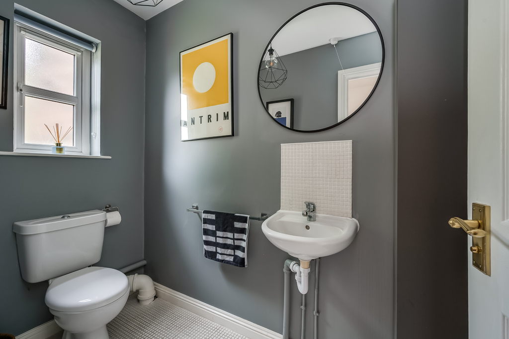 Mosaic tiled floor, Wash hand basin, Twin flush WC, Single panel radiator, uPVC Double glazed window.
