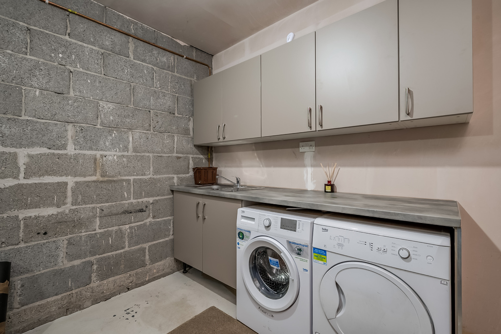 Ideal gas boiler, High and low level units, Stainless steel sink and drainer, Space for washing machine, Space for tumble dryer, Garage door.