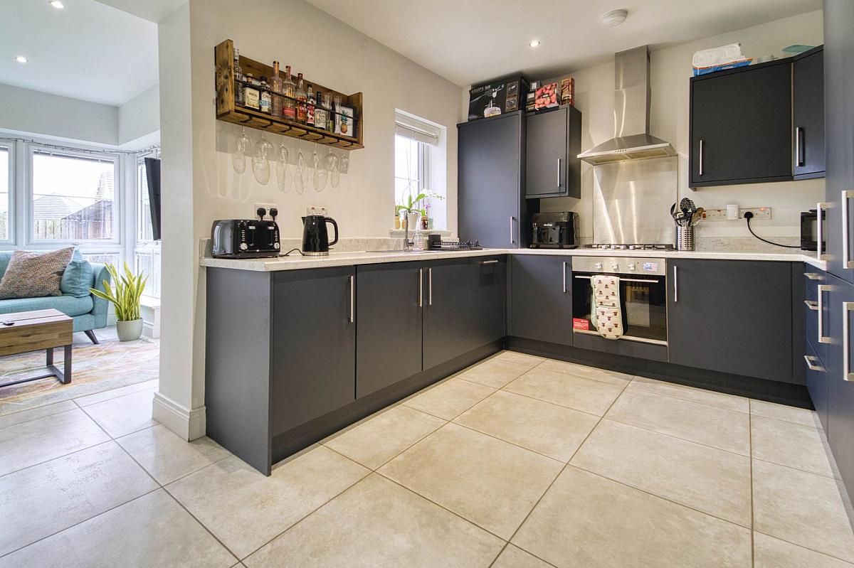Extensive range of high and low level units. Large and small bowl stainless steel sink unit with mixer tap. 4 ring gas hob and built-in oven. Stainless steel splashback and stainless steel extractor unit. Integrated dishwasher. Integrated fridge freezer. Integrated washing machine. Downlighters. Tiled floor.