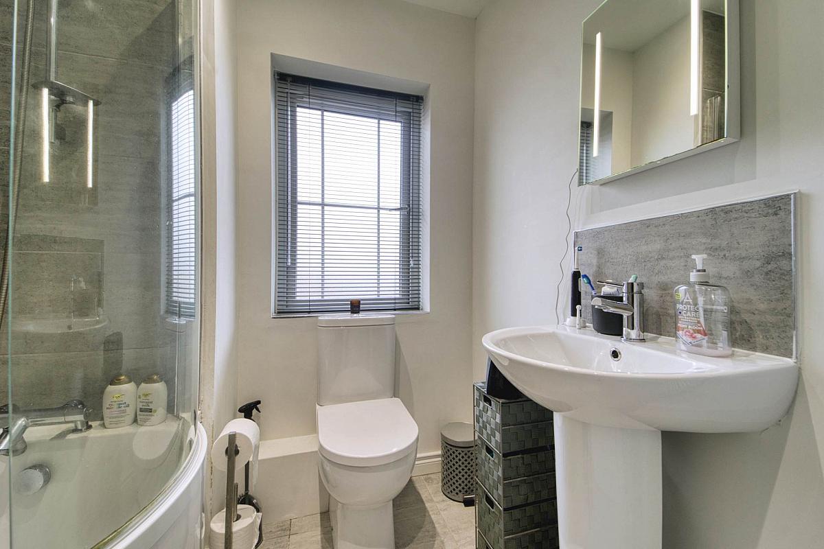 White suite to include shower/bath with mixer tap and shower attachment, and shower screen; pedestal wash hand basin with mixer tap; and w.c. Part tiled walls. Tiled floor. Extractor fan.