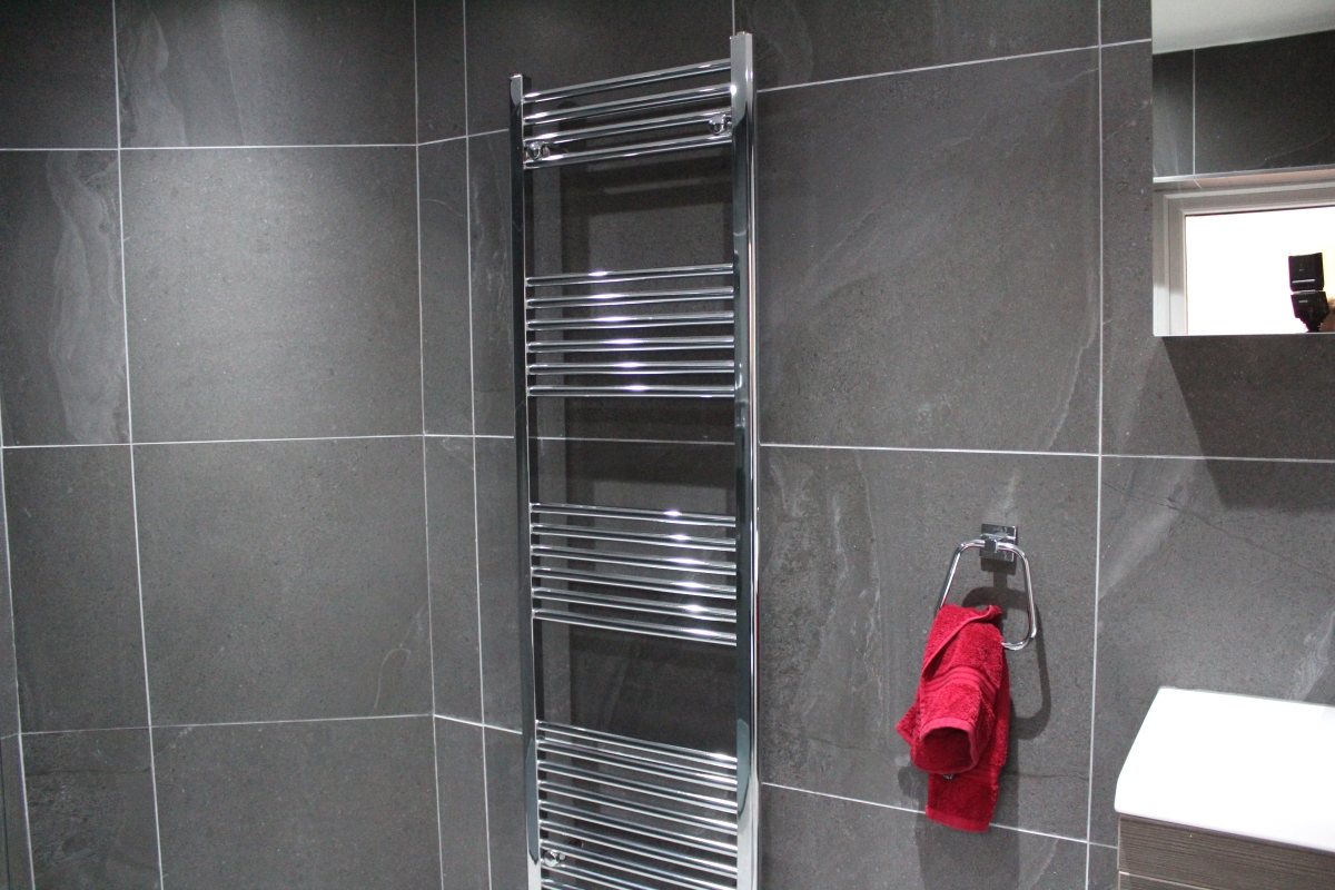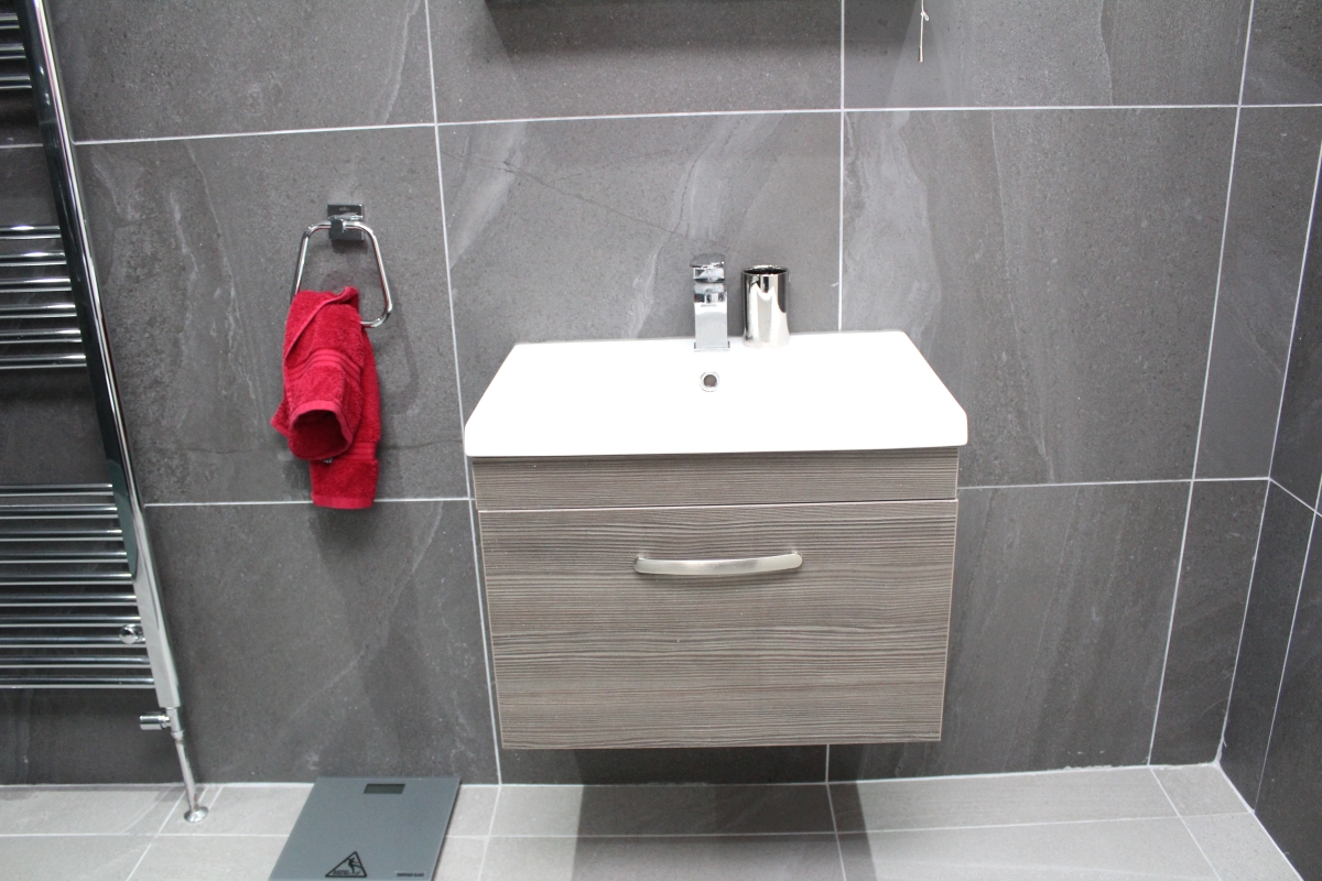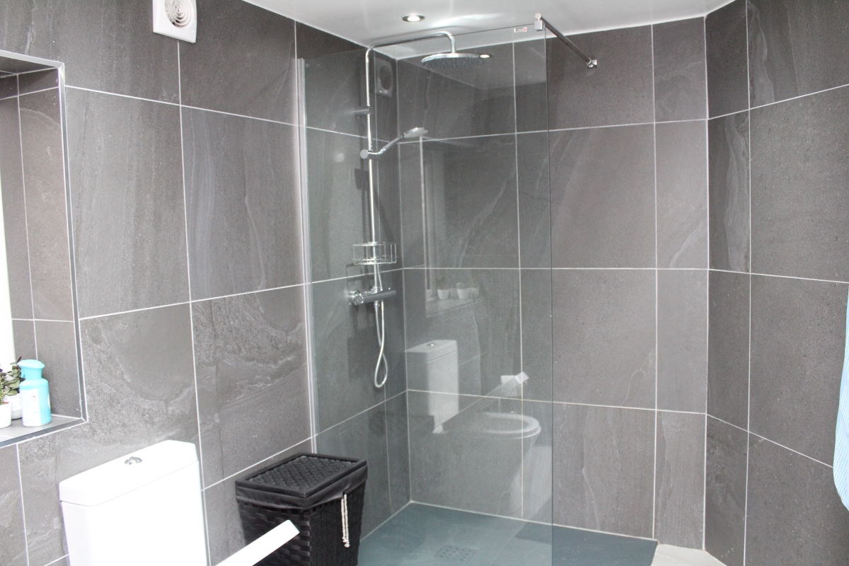 Modern white contemporary suite comprising walk in shower cubicle,with chrome drencher shower head, wall mounted vanity unit with chrome mixer tap, low flush WC. Chrome ladder style radiator. Wall and floor tiling. Extractor fan. Recessed ceiling lighting. Storage.