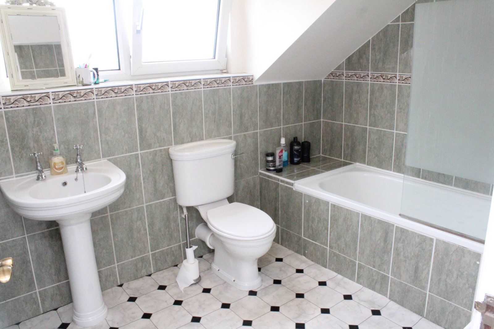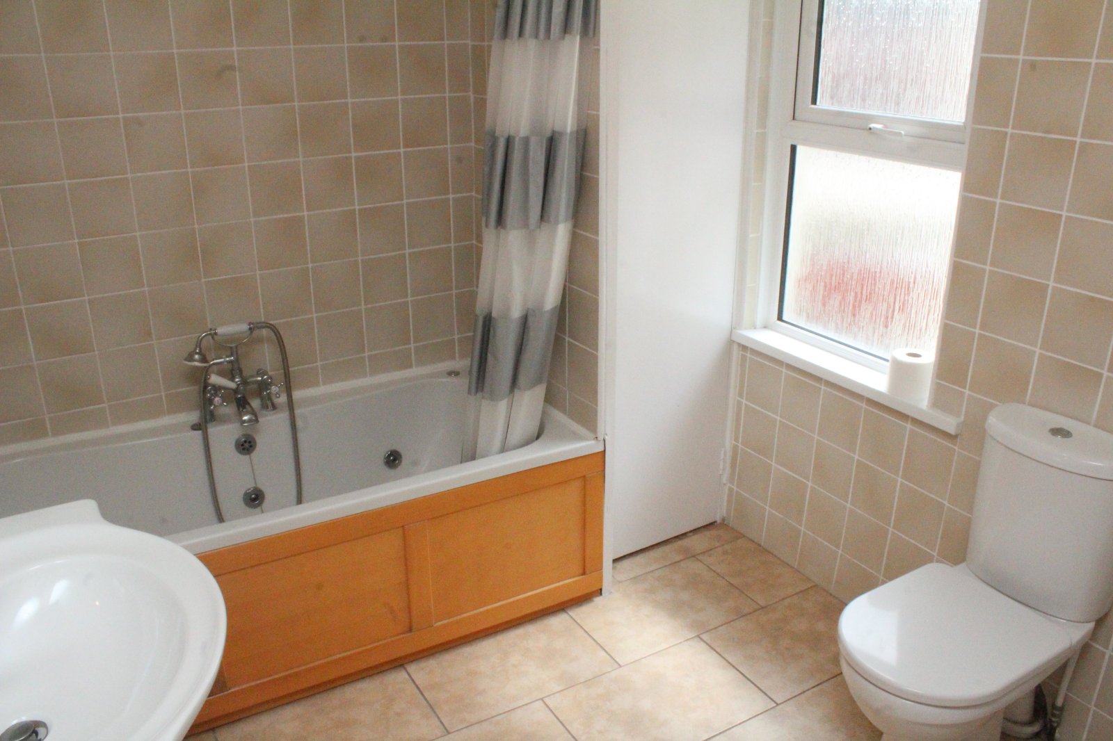 Three piece white suite comprising panelled bath with mixer tap, vanity unit, low flush WC. Wall and floor tiling. radiator.