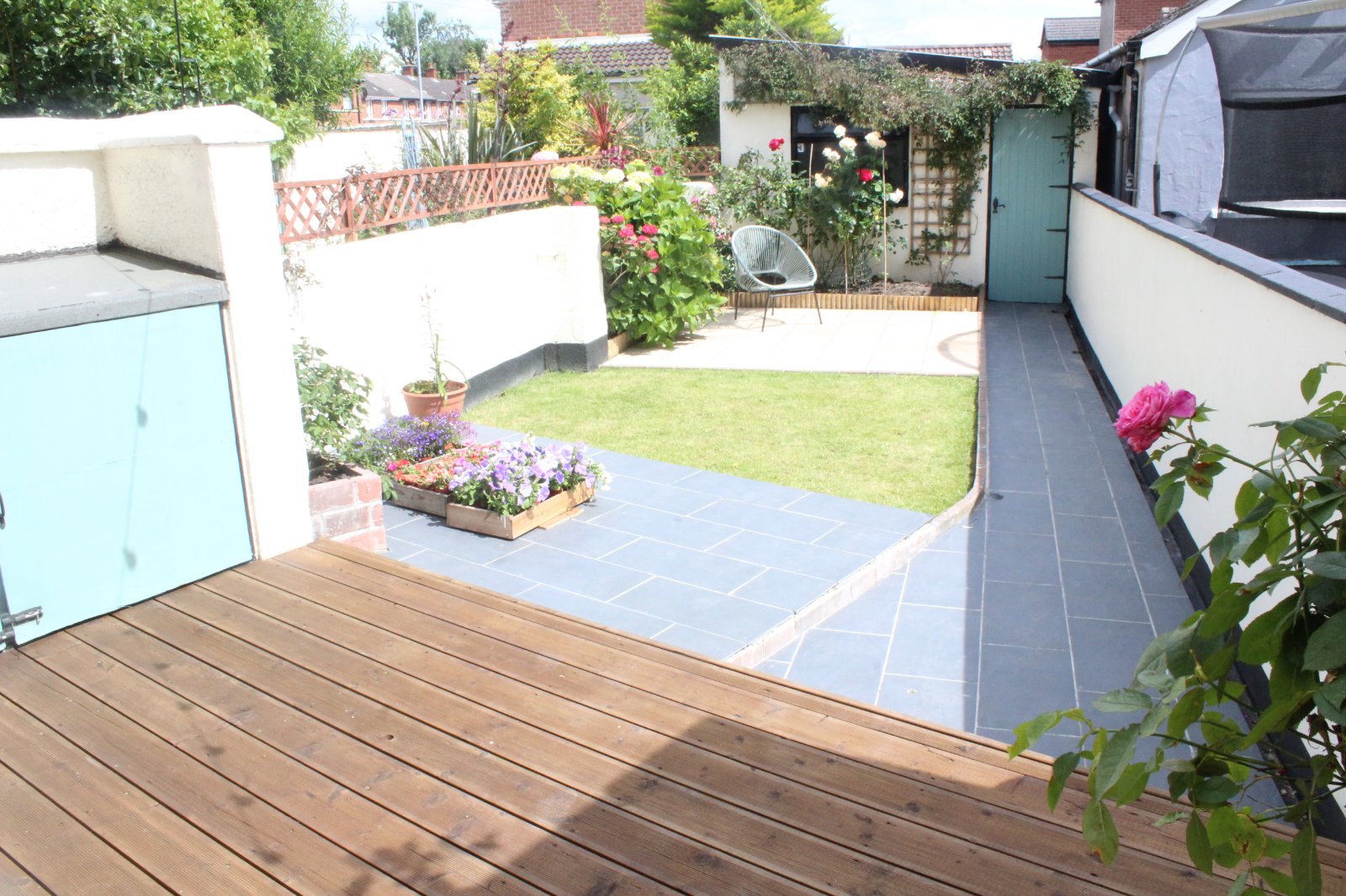 Private rear garden in lawn and shrubs. Paved patio and decking area.