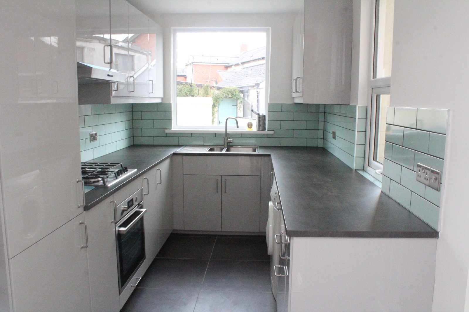 Modern fitted kitchen with a range of base and eye level units, plumbed for washing machine, electric hob and oven, under stairs storage.
