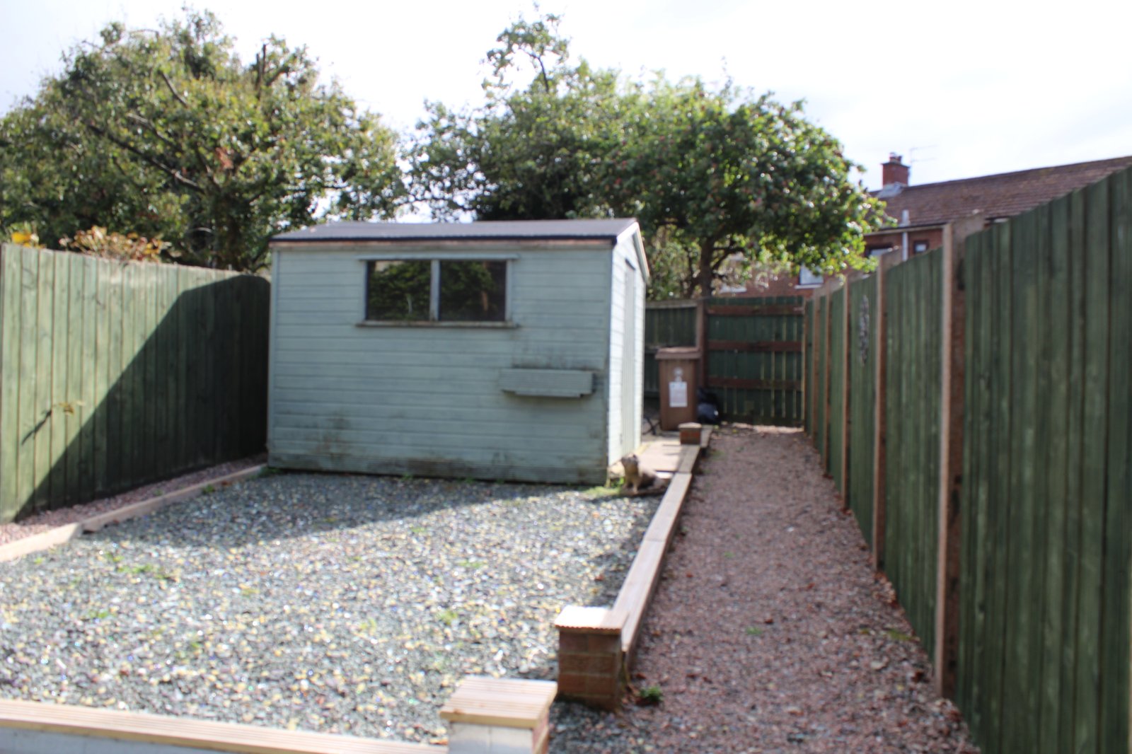 Spacious rear garden in pebbles, paved patio area, shed and shrubs.