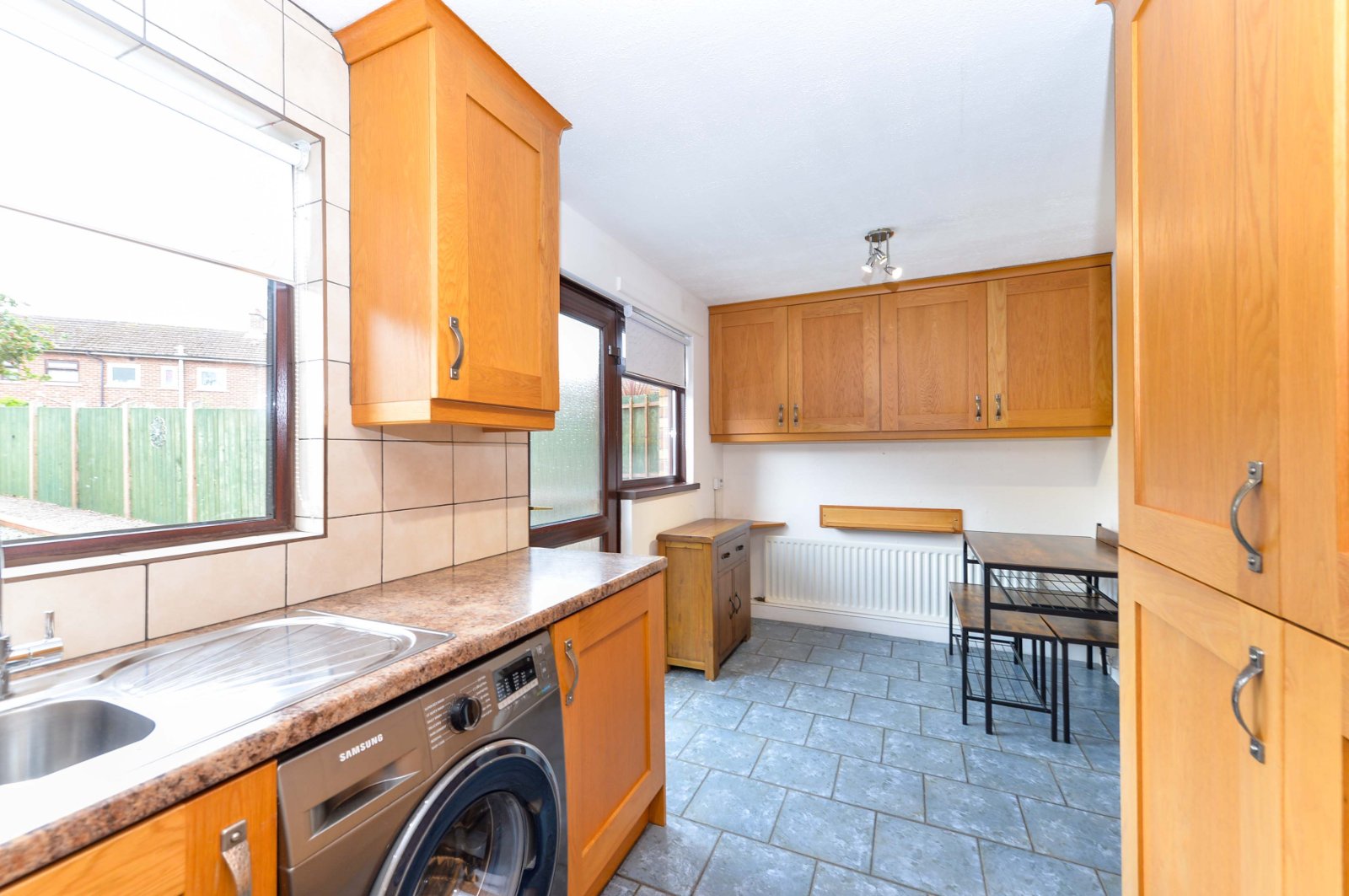 Modern Shaker style wood effect kitchen with ample wall and base units. Formica work surfaces. One and a half bowl stainless steel sink unit with chrome mixer tap and drainer, Integrated four ring electric hob and built in single stainless steel oven with integrated extractor hood. Appliances include fridge/freezer and washing machine. Wall and floor tiling. Dining area.