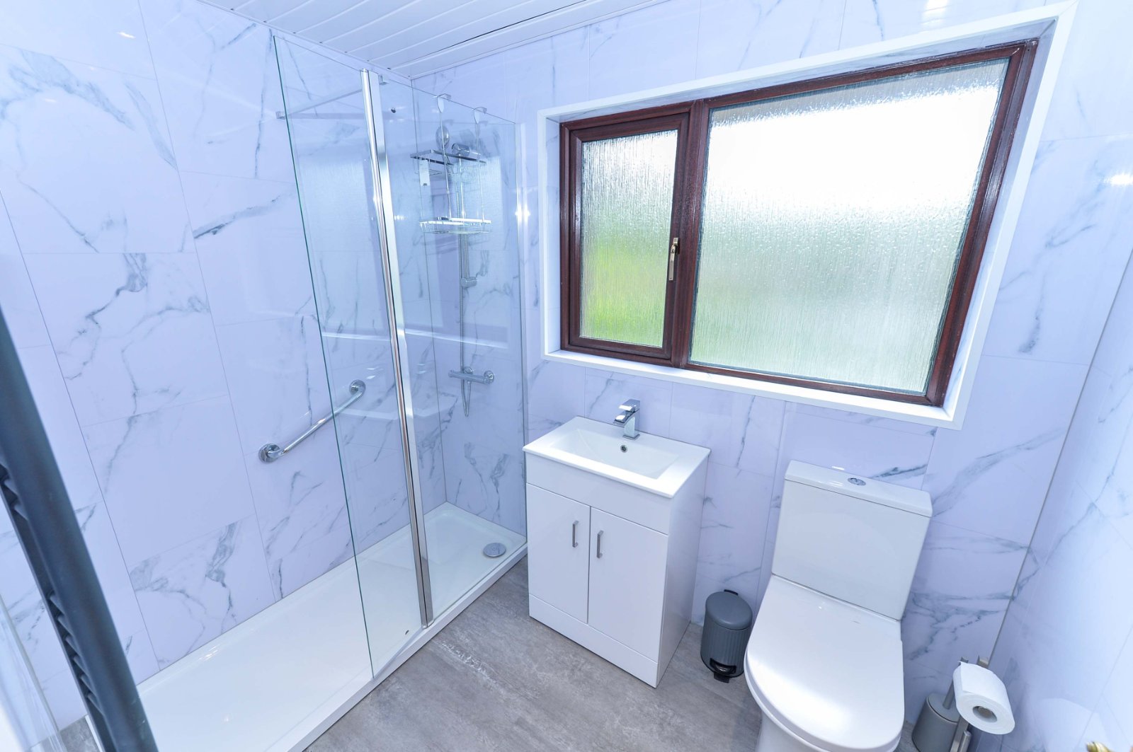 Recently installed white contemporary bathroom suite comprising, wall mounted basin and vanity unit with chrome mixer tap. Close coupled WC. Walk in shower enclosure. Wall panelling. Wall mounted radiator. Recessed lighting. Panel ceiling.