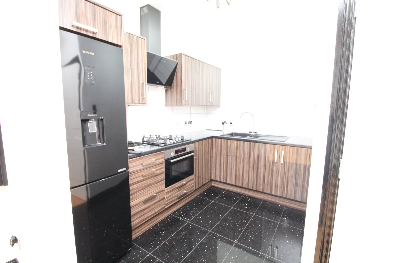 Ample wall and floor units finished in a laminate Walnut gloss effect with soft closing door. Laminate worksurfaces. Tiled splashback. One and a half bowl stainless steel sink unit with chrome mixer tap.,stainless steel 4 ring gas hob and single single built in oven and microwave combined. Washing machine. Chimney style extractor fan. Radiator. Wall and floor tiling. Recessed lighting.