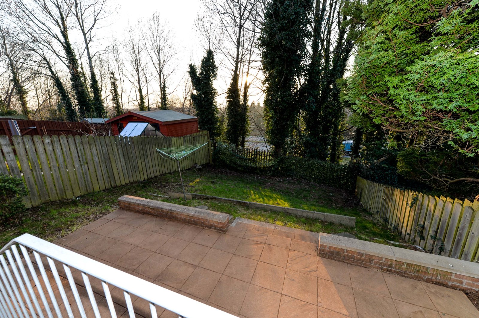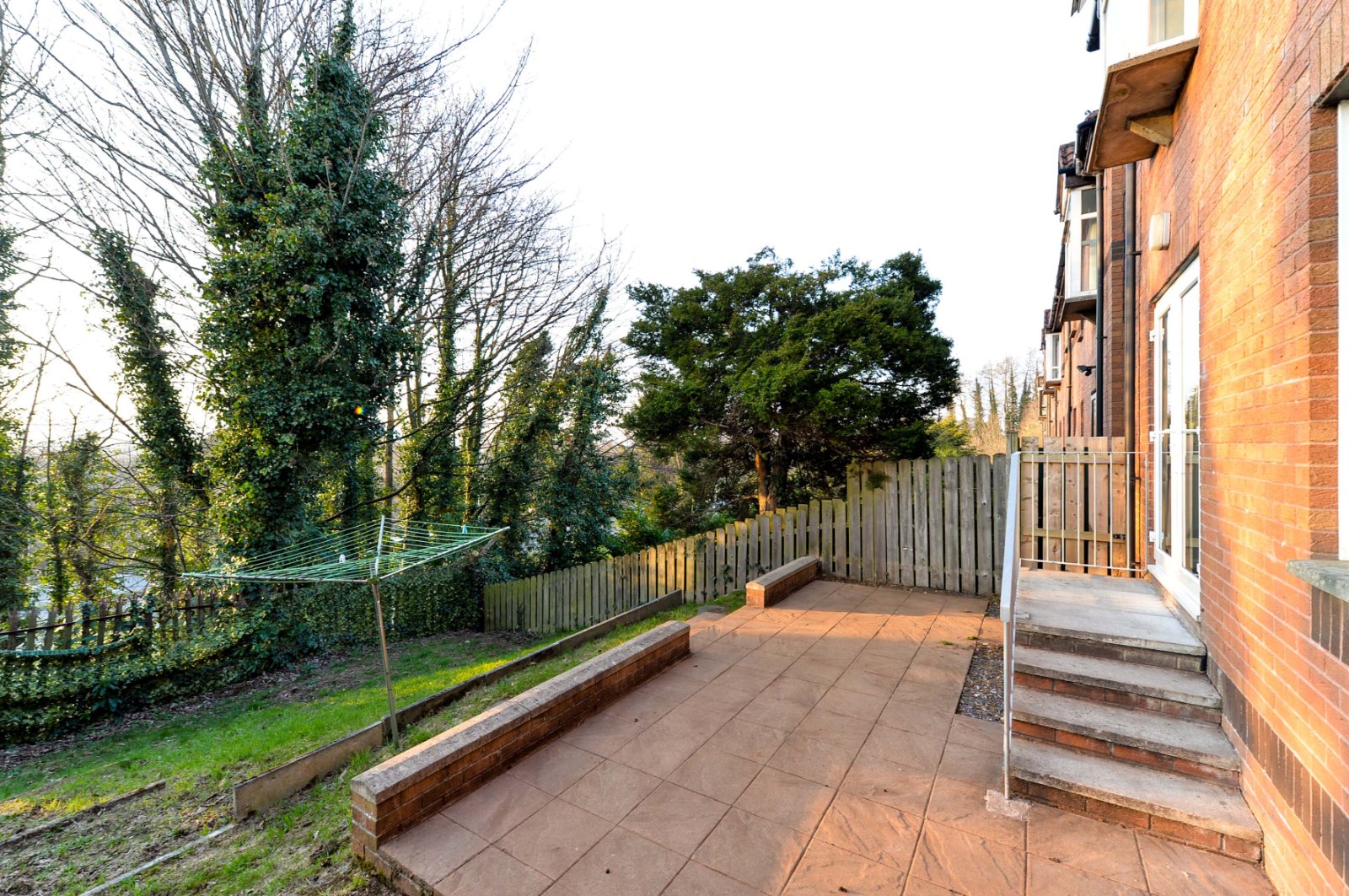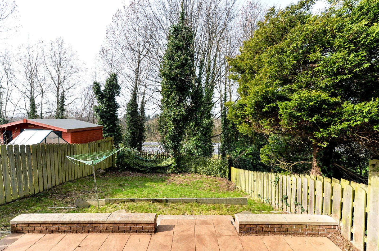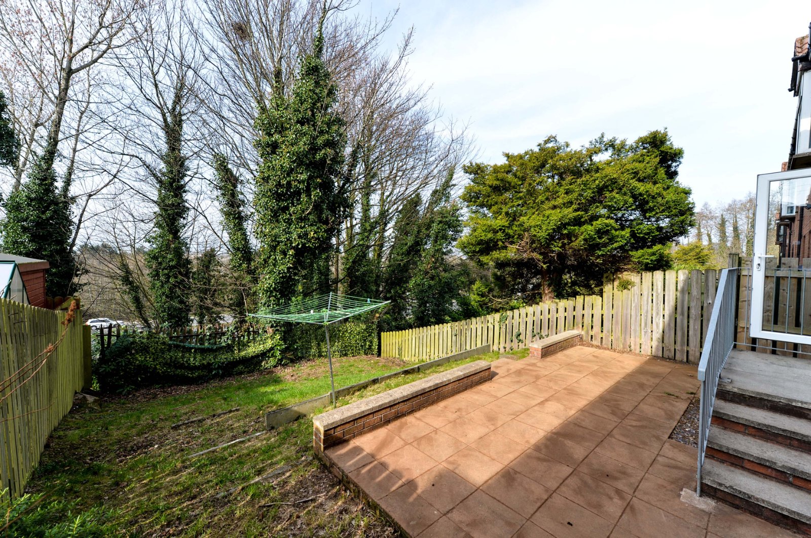 Private rear garden in lawn with paved patio area.