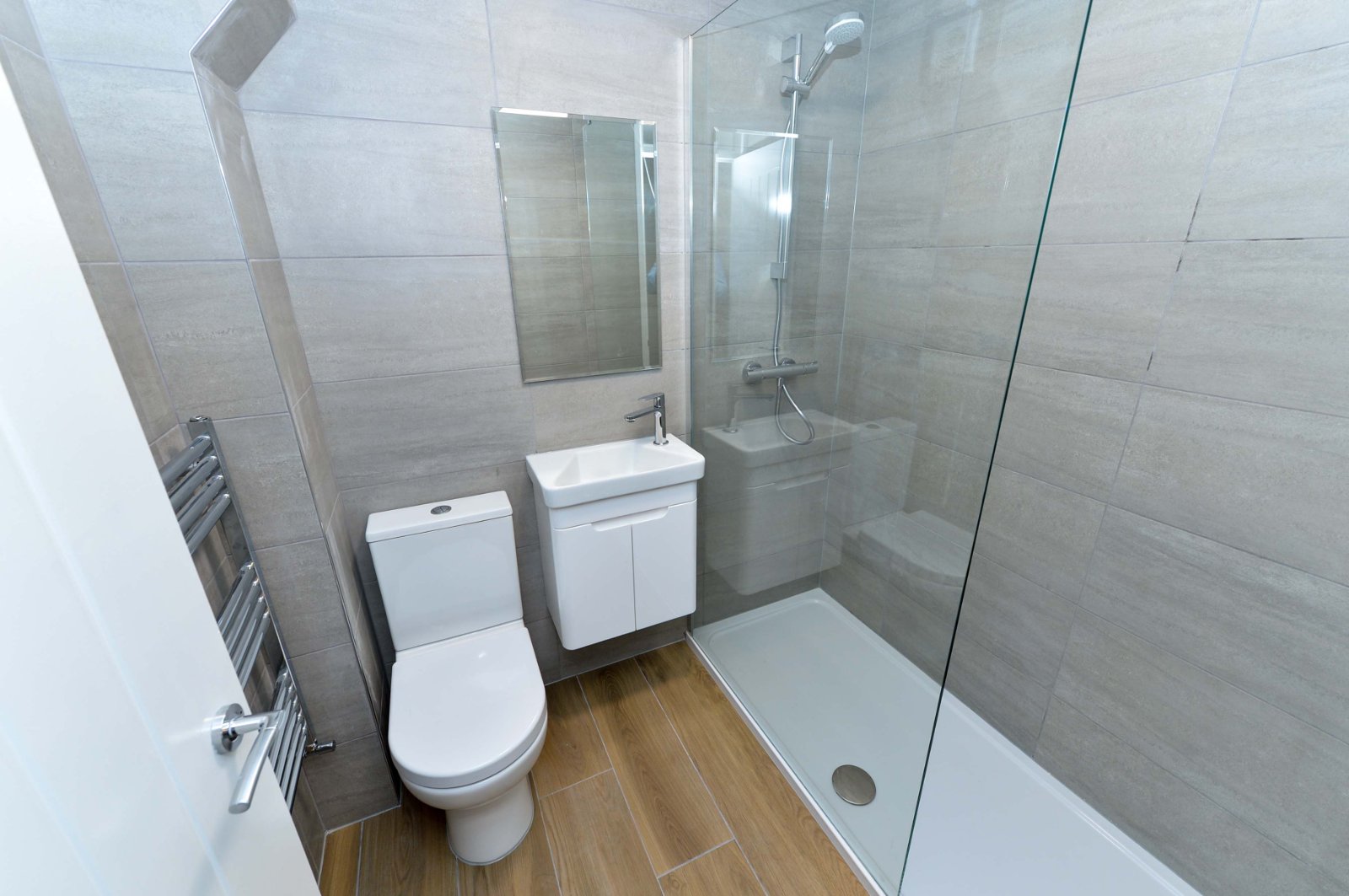 Contemporary shower room comprising of extended walk in shower cubicle, white wall mounted basin with vanity unit and chrome mixer tap. Low flush WC. Ceramic wall and floor tiling. Chrome ladder style radiator. Extractor fan.