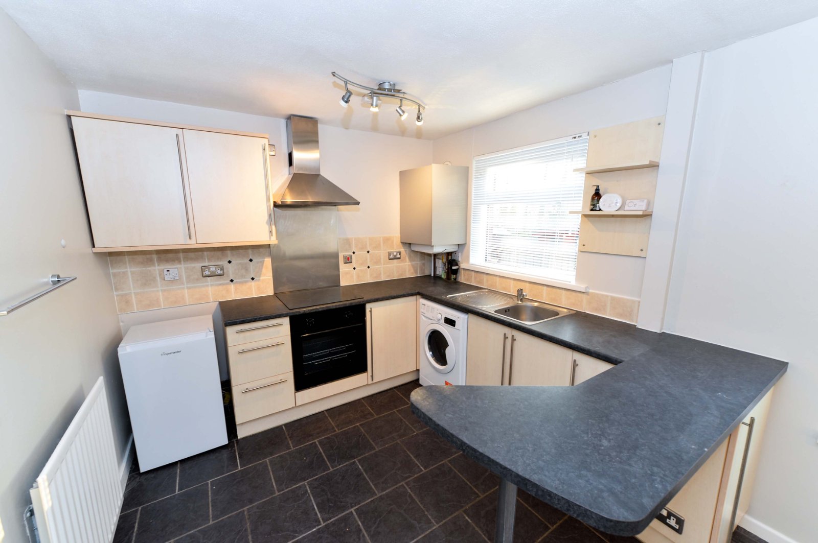 Open plan Kitchen has an excellent range of modern high and low soft closing units, work surface, stainless steel one bowl sink unit with dual mixer tap. Integrated appliances include 4 ring electric hob, built in oven with stainless steel chimney extractor fan, integrated washing machine and fridge freezer. Built in storage cupboard housing gas fired boiler.
